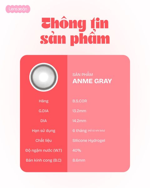 Chất liệu: Silicone Hydrogel - chất liệu cấp ẩm cao với khả năng trao đổi oxi tốt cho mắt thở. Thiết kế: Sở hữu thiết kế 2 dải highlight đối xứng cùng viền lens mỏng và hiệu ứng giãn nhẹ, giúp đôi mắt to tròn, long lanh tự nhiên, dễ đeo và phù hợp với nhiều phong cách makeup hằng ngày.Hạn sử dụng: 6 tháng có sẵn đủ độ từ 0-8 độ ở nhà Lens Xoắn Hãng: B.S.COR Chi tiết sản phẩm: ANME GRAY Kết luận ANME GRAY không chỉ là một mẫu lens màu xám băng lạnh cùng hiệu ứng highlight long lanh giúp đôi mắt trở nên sâu, sáng và cuốn hút hơn mà vẫn giữ được nét tự nhiên, sang xịn.