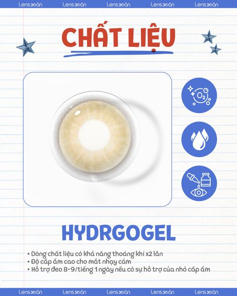 Chất liệu Hydrogel – Sự lựa chọn an toàn và êm dịu cho đôi mắt Hydrogel là một trong những chất liệu phổ biến nhất hiện nay trong sản xuất kính áp tròng nhờ khả năng cấp ẩm cao và độ mềm mại vượt trội . Với công nghệ hiện đại, dòng lens Hydrogel được xem là lựa chọn lý tưởng cho những bạn có đôi mắt nhạy cảm, dễ khô hoặc thường xuyên đeo lens trong thời gian dài.