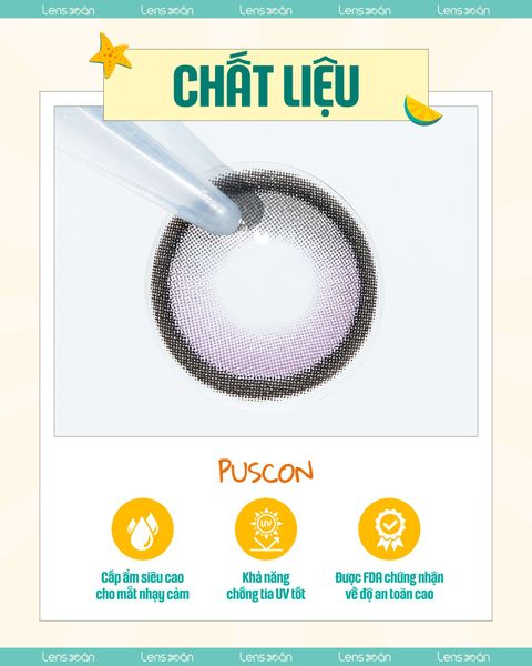 Chất liệu Puscon - cấp ẩm cao, an toàn và thoải mái trong quá trình đeo Cấp ẩm siêu cao – phù hợp cho mắt nhạy cảm Lens được làm từ chất liệu Puscon , nổi tiếng với khả năng giữ ẩm vượt trội. Điều này giúp mắt luôn mềm mại, hạn chế khô rát kể cả khi đeo nhiều giờ. Đặc biệt phù hợp với những bạn có đôi mắt nhạy cảm hoặc thường xuyên phải làm việc trong môi trường điều hòa.