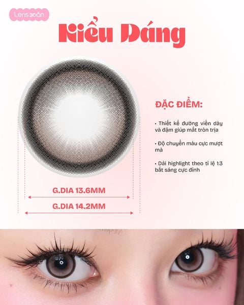 Dải highlight bắt sáng theo tỉ lệ cân đối , giúp đôi mắt trông long lanh hơn khi nhìn dưới ánh đèn hoặc chụp ảnh. Kết hợp với DIA: 14.2 mm cùng G.DIA: 13.6mm , lens mang lại hiệu ứng trông kiêu kì thu hút như mắt mèo.