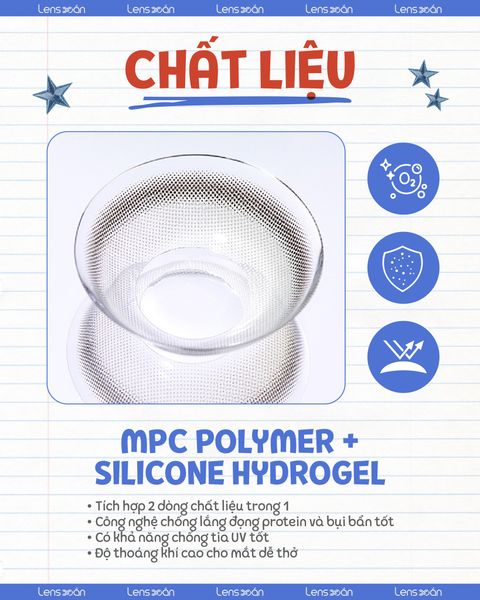 MPC Polymer (2-Methacryloyloxyethyl phosphorylcholine Polymer): Đây là vật liệu sinh học mô phỏng cấu trúc của màng tế bào, có khả năng giữ ẩm tự nhiên cực kỳ tốt. Khi đeo, bề mặt lens duy trì độ trơn mượt, hạn chế ma sát với giác mạc, nhờ đó giảm cảm giác khô rát hay cộm. MPC Polymer còn giúp lens trong suốt, giữ màu sắc tự nhiên khi đeo.