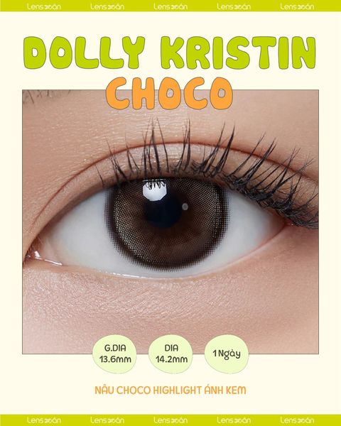 Chất liệu: Silicone Hydrogel - chất liệu cấp ẩm cao với độ thoáng khí và cấp ẩm siêu vượt trội gấp 5 lần các dòng kính áp tròng thông thường.Thiết kế: Hiệu ứng viền đậm kiểu smoky ring cùng độ chuyển sắc tinh tế từ nâu trung tính đến xám khói đem lại hiệu ứng mắt mềm, trong và có chiều sâu kiểu Hàn Quốc.Hạn sử dụng: 1 ngày có sẵn đủ độ từ 0-6 độ ở nhà Lens Xoắn Hãng: HAPA KRISTIN Chi tiết sản phẩm: DOLLY KRISTIN CHOCO Kết luận HAPA KRISTIN DOLLY KRISTIN CHOCO là hội tụ đầy đủ những gì khách hàng yêu thích ở HAPA KRISTIN : màu trong trẻo, hiệu ứng long lanh nhẹ và độ đeo êm thoáng suốt cả ngày. Tone nâu pha kem lên mắt vừa tự nhiên vừa cuốn, kết hợp với đường viền mảnh và thiết kế highlight đối xứng giúp đôi mắt to tròn, sâu và sáng hơn. Chất liệu Silicone Hydrogel mang lại khả năng trao đổi oxy tốt, giữ ẩm ổn định và chống tia UV, rất phù hợp cho những bạn đeo lens nhiều giờ mỗi ngày.