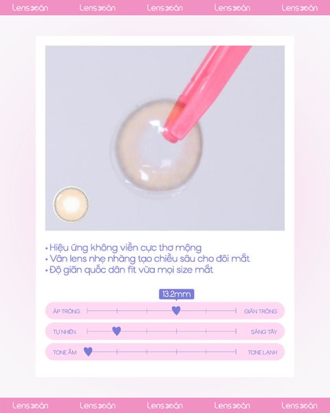 Vân lens được thiết kế tỉ mỉ với độ loang mịn và sáng vừa phải , tạo hiệu ứng chiều sâu cho tròng mắt. Ánh nâu hổ phách được hòa quyện tinh tế giúp mắt phản chiếu ánh sáng dịu, làm ánh nhìn thêm long lanh và có hồn hơn.