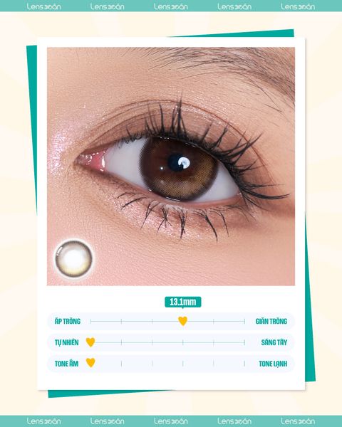 Tone nâu dịu dàng tôn da, làm rõ độ cong mi và tạo cảm giác mắt long lanh một cách tự nhiên dưới mọi điều kiện ánh sáng – từ ánh nắng ban ngày đến flash trong studio hay sân khấu. Đây là mẫu lens phù hợp cho các layout trong trẻo, thanh lịch, đặc biệt là