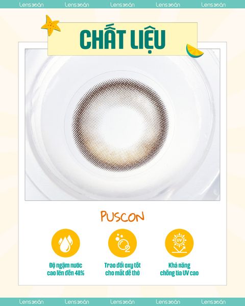 Với độ ngậm nước lên đến 48% , chất liệu PUSCON giúp bề mặt lens luôn mềm và ẩm, đặc biệt phù hợp với những nàng phải đeo cả ngày hoặc thường xuyên ở môi trường điều hòa. Nhờ khả năng trao đổi oxy tốt , đôi mắt luôn được “thở” thoải mái, hạn chế tình trạng mỏi, đỏ hay khô rát cuối ngày.