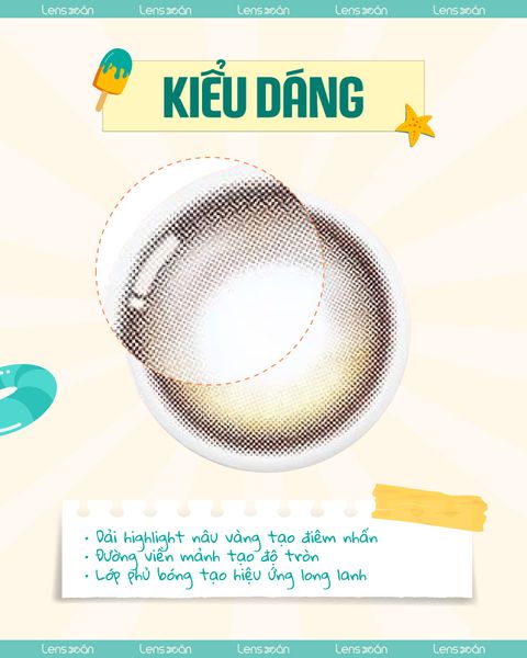 Thiết kế: Vân lens 2 dải màu cực nhẹ nhàng nhưng vẫn gây điểm nhấn bởi highlight phủ bóng cho đôi mắt thêm phần long lanh giúp nàng nâng tầm nhan sắc.