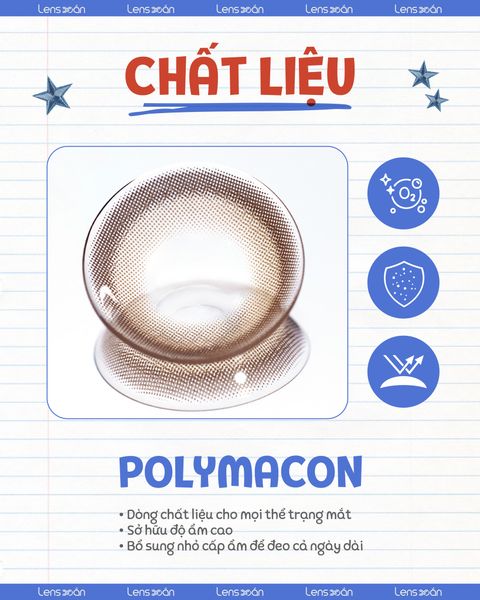 Chất liệu Polymacon - chất liệu phổ biến thường thấy, phù hợp với người mới sử dụng. Polymacon là một loại hydrogel mềm , được sử dụng phổ biến trong sản xuất kính áp tròng. Đây là vật liệu copolymer của HEMA (Hydroxyethyl Methacrylate) , có khả năng ngậm nước tốt, giúp lens mềm mại và thoải mái khi đeo.