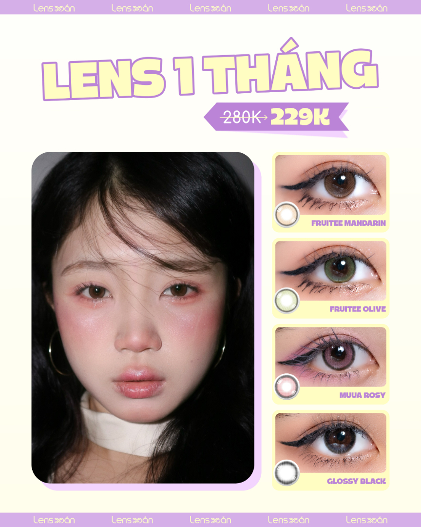 Lens 1 tháng ưu đãi 280K -> 229K Check ngay list "Lens 1 tháng hunter"Fruitee Mandarin : Tone nâu cam ánh kim trong veo, phù hợp cho makeup daily.Fruitee Olive : Sở hữu ánh xanh ngọc lục siêu "mọng nước", mang tone xanh olive nhưng lên mắt tạo hiệu ứng trong veo nhẹ nhàng, giúp cô nàng "đổi gió" cho những ngày muốn thay đổi phong cách.Muua Rosy : Lens hồng không hề khó đeo như bạn nghĩ, kết hợp thêm hiệu ứng viền dày tao độ sắc nét và điểm nhấn cho đôi mắt.Glossy Black : Tone đen tuyền basic, màu lens unisex phù hợp cho cả nam và nữ.