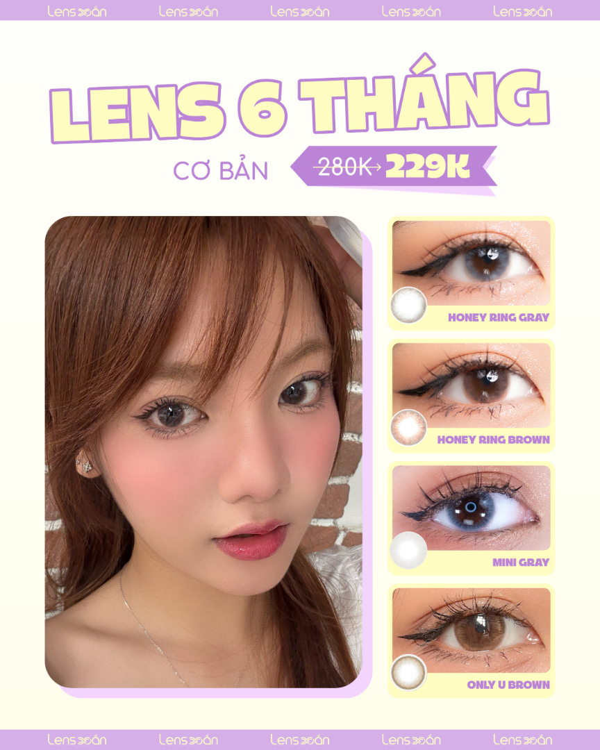 Lens 6 tháng cơ bản ưu đãi 280K -> 229K Thêm ngay list "Lens 6 tháng hunter" vào giỏ hàng:Honey Ring Brown : Nâu mật ong siêu ngọt ngào với mức giãn nhẹ tạo độ to tròn cho đôi mắt.Honey Ring Choco : Nâu choco ánh hồng sữa với thiết kế không viền tạo hiệu ứng trong trẻo.Mini Gray : Ánh xám thuần trong veo, không giãn, cực phù hợp cho những ai có dáng mắt bé.Only U Brown : Sắc nâu trong veo tựa nắng sớm mai phù hợp cho những ngày "lười makeup".