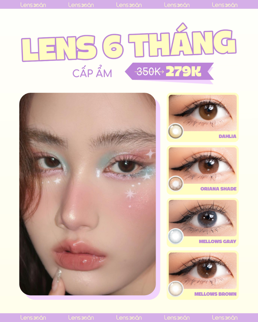 Lens 6 tháng cấp ẩm cao ưu đãi 350K -> 279K Dahlia Brown: Ánh nâu vàng phủ bóng siêu long lanh.Oriana Shade Brown : Lens nâu mang hiệu ứng 2 dải màu siêu lạ lẫm, thiết kế đường viền nhẹ giúp đôi mắt thêm tròn trịa.Oriana Shade Gray : Sắc xám khói highlight ánh nâu mật ong với mức giãn "quốc dân" cho mọi dáng mắt.Mellows Cotton Brown : Ánh nâu mật ong không viền trong veo phù hợp cho mọi dáng mắt.Mellows Mystic Gray : Xám trong veo mix chút ánh xanh pastel tạo điểm nhấn.