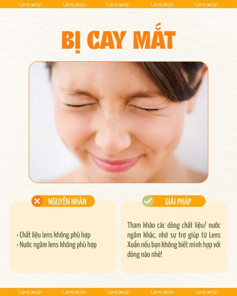 Cay mắt khi đeo lens Đôi khi cay mắt xuất hiện do dung dịch ngâm hoặc chất liệu lens chưa phù hợp với thể trạng. Mẹo nhỏ: tráng lens bằng nước nhỏ mắt chuyên dụng trước khi đeo và tránh dụi mắt, ngoài ra chọn chất liệu lens và dòng ngâm phù hợp. Vậy là nàng có thể an tâm tận hưởng đôi mắt sáng trong cả ngày.