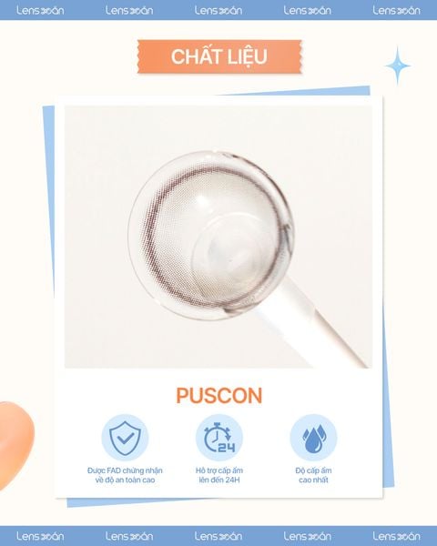 Khả năng giữ ẩm vượt trội đến 24h: Một trong những điểm mạnh của Puscon là khả năng giữ nước và cấp ẩm cực tốt . Nhờ đặc tính hút nước ổn định, lens có thể duy trì cảm giác ẩm mượt trên mắt đến 24 giờ , giúp đôi mắt luôn dễ chịu ngay cả khi phải đeo lens trong thời gian dài. Điều này đặc biệt hữu ích cho những ai làm việc văn phòng, thường xuyên tiếp xúc với điều hòa hoặc màn hình máy tính.