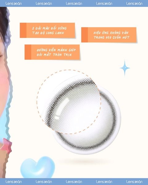 Bao quanh lớp vân trong trẻo là một đường viền đen mảnh, đóng vai trò làm nổi bật tròng mắt và tạo độ to tròn vừa phải. Thiết kế này không chỉ giúp đôi mắt thêm hài hòa mà còn khắc phục nhược điểm cho những bạn thường xuyên đeo gọng kính dày khiến mắt trông mệt mỏi. Viền lens sắc nét ôm lấy phần vân xám khói, mang lại cảm giác tự nhiên và nâng tầm nhan sắc tinh tế.