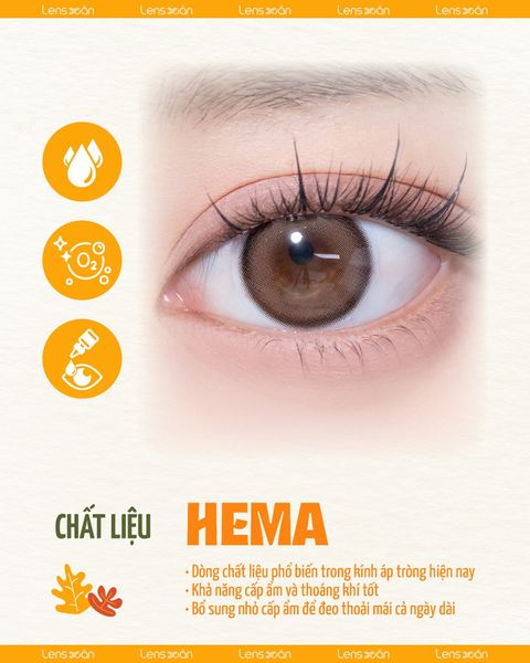 Khả năng cấp ẩm và thoáng khí Một trong những ưu điểm lớn của chất liệu HEMA chính là khả năng cấp ẩm vừa đủ, giúp hạn chế tình trạng khô rát mắt khi đeo lâu. HEMA cũng có độ thoáng khí ổn định, thích hợp với những bạn cần đeo lens trong nhiều giờ liền như đi học, đi làm hoặc tham gia sự kiện.