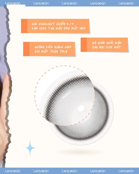 Bên cạnh đó, đường viền mảnh bao quanh lens vừa đủ để định hình tròng mắt, tạo cảm giác to tròn hài hòa . Với độ giãn tiêu chuẩn cùng DIA 14.2MM và G.DIA 13.2MM , thiết kế này phù hợp cho nhiều dáng mắt khác nhau, từ mắt nhỏ đến mắt trung bình, giúp tổng thể gương mặt cân đối và hài hòa hơn.