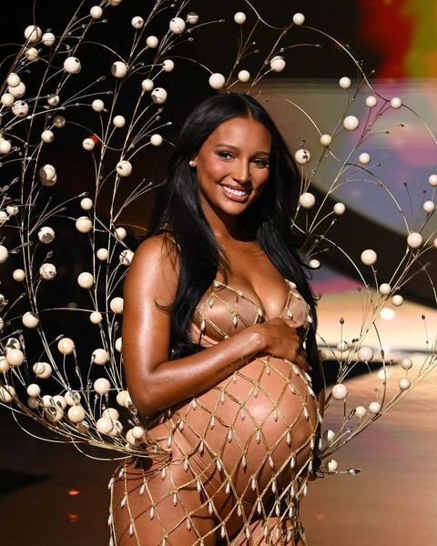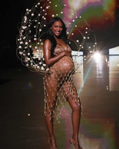 Jasmine Tookes – Khởi động show với vẻ đẹp quyền lực Phụ Nữ Jasmine đã làm nên một bước ngoặt tinh tế: mang thai ở tháng cuối vẫn tự tin sải bước với thần thái “mẹ bầu quyền lực”, outfit ngọc trai ánh kim lấp lánh càng làm tăng thêm vẻ nữ tính nhưng không kém phần mạnh mẽ. Việc mở màn show với hình ảnh như vậy như một lời khẳng định: đẳng cấp thiên thần không chỉ đến từ vóc dáng mà còn từ tinh thần.