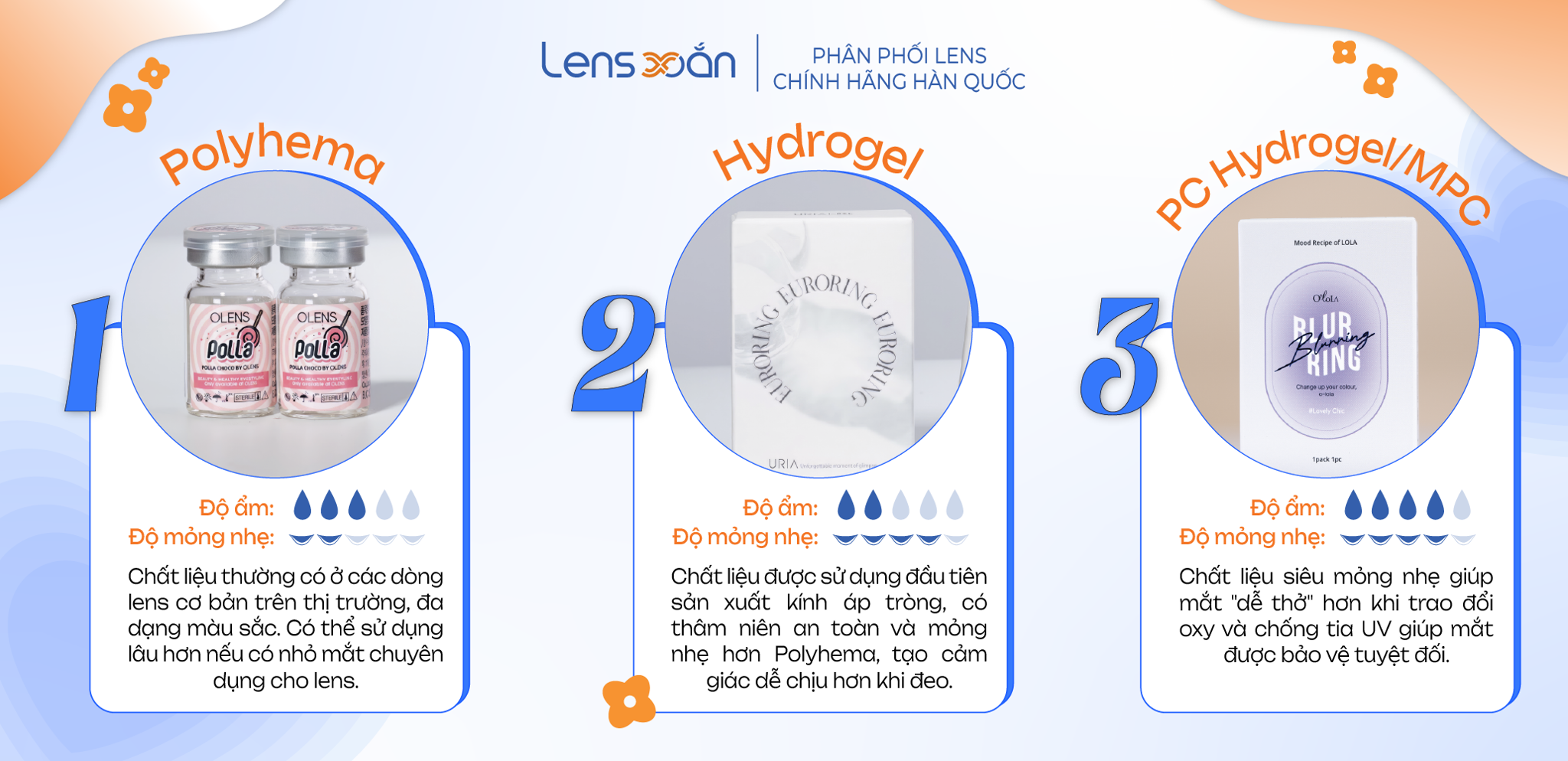 Polyhema: Chất liệu thường có ở các dòng lens cơ bản trên thị trường, đa dạng màu sắc. Có thể sử dụng lâu hơn nếu có sự hỗ trợ bởi nhỏ mắt chuyên dụng lens.