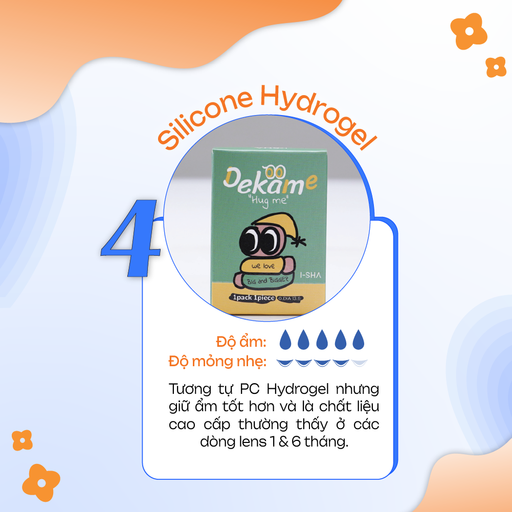 Silicone Hydrogel: Khả năng tương tự như PC nhưng có phần giữ ẩm cao hơn chút. Đây cũng là 1 chất liệu cao cấp thường thấy ở các dòng lens ngắn hạn.
