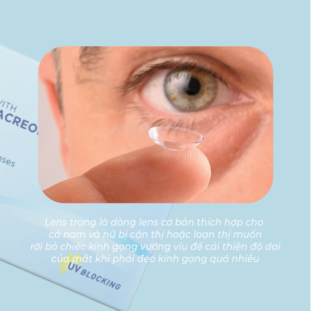 Lens trong là dòng lens cơ bản thích hợp cho cả nam và nữ bị cận thị hoặc loạn thị muốn rời bỏ chiếc kính gọng vướng víu để cải thiện độ dại của mắt khi phải đeo kính gọng quá nhiều. Ngoài ra lens trong suốt còn giúp cải thiện khuôn mặt tránh việc bị chiếc kính gọng phong ấn nhan sắc. Đối với những bạn nam thường xuyên chơi thể thao như đá bóng, tenis, cầu lông,...( trừ bơi lội) chạy nhảy đeo kính gọng sẽ rất vướng víu và kính áp tròng trong suốt sẽ hỗ trợ, giúp các bạn có thể tự tin, thoải mái vận động cường độ cao mà không lo bị cản trở bởi kính gọng.