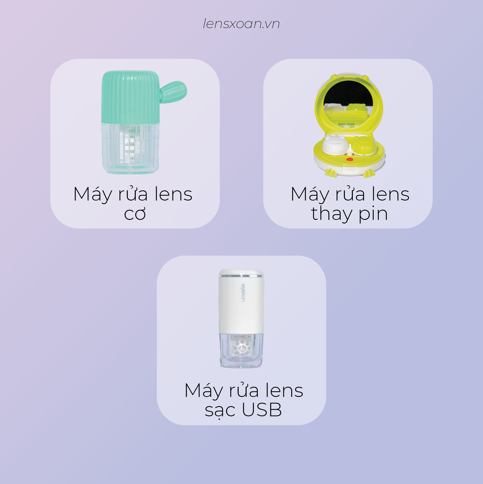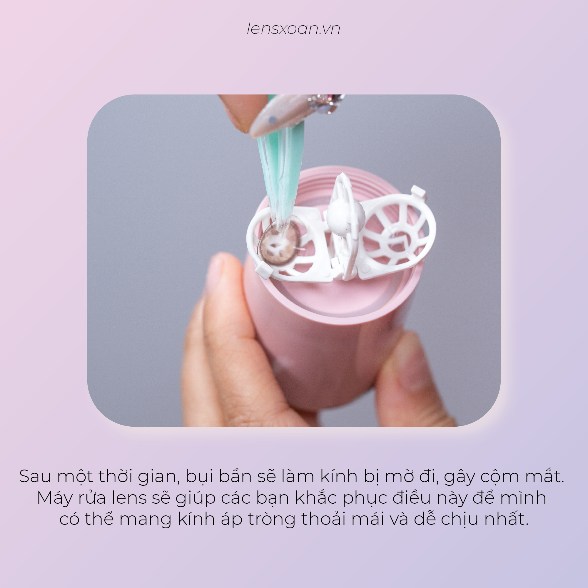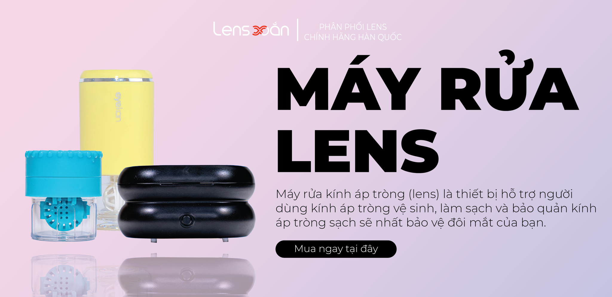 Máy rửa kính áp tròng (lens) là thiết bị hỗ trợ người dùng kính áp tròng vệ sinh, làm sạch và bảo quản kính áp tròng sạch sẽ nhất bảo vệ đôi mắt của bạn. Có nhiều dụng cụ hỗ trợ vệ sinh lens và nhiều mức giá để bạn có thể lựa chọn như: Cốc rửa lens bằng tay , Máy rửa lens bằng pin , Máy rửa lens sạc usb ,... Sau thời gian sử dụng, bụi bẩn sẽ dính vào kính áp tròng của bạn làm kính bị cứng hơn, bị mờ đi, gây cộm mắt. Máy rửa lens sẽ giúp các bạn khắc phục điều này để mình có thể mang kính áp tròng thoải mái và dễ chịu nhất. Đặc biệt, máy rửa kính sẽ giúp tăng tuổi thọ cho lens nếu bạn sử dụng lens dài hạn.