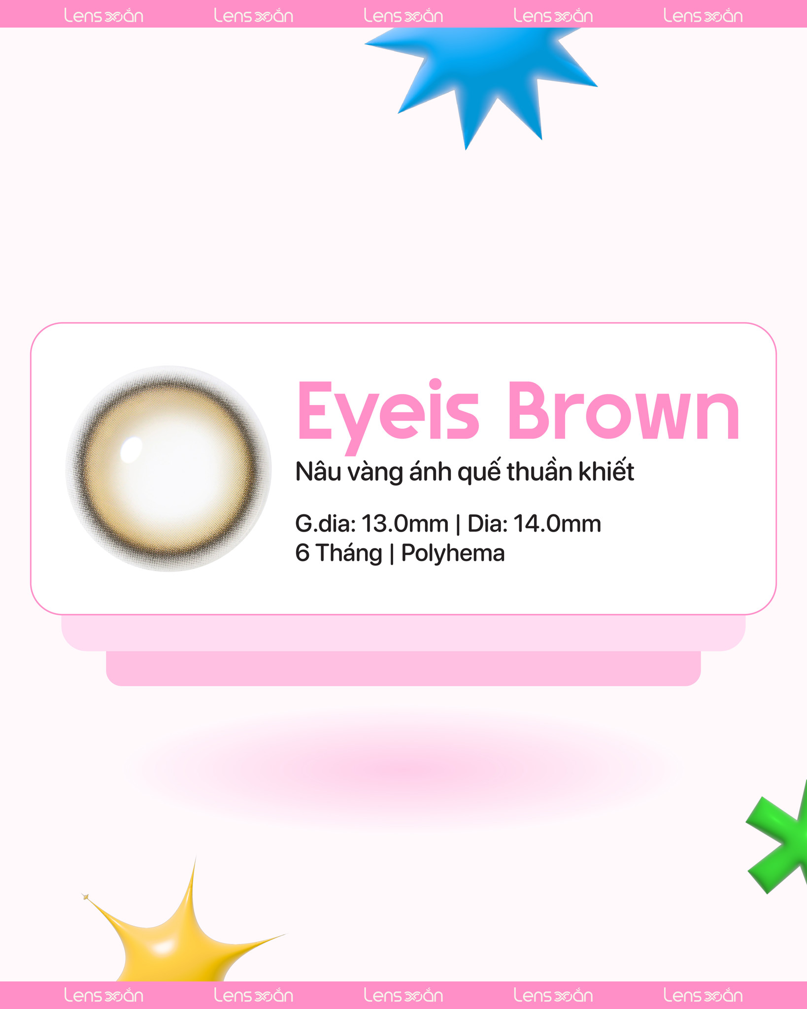 Hãng i-DOL LENS Hạn sử dụng 6 tháng Graphic dia (Đường kính phần màu) 13.0mm Dia (Đường kính phần màu và viền trong) 14.0mm Chất liệu Polyhema
