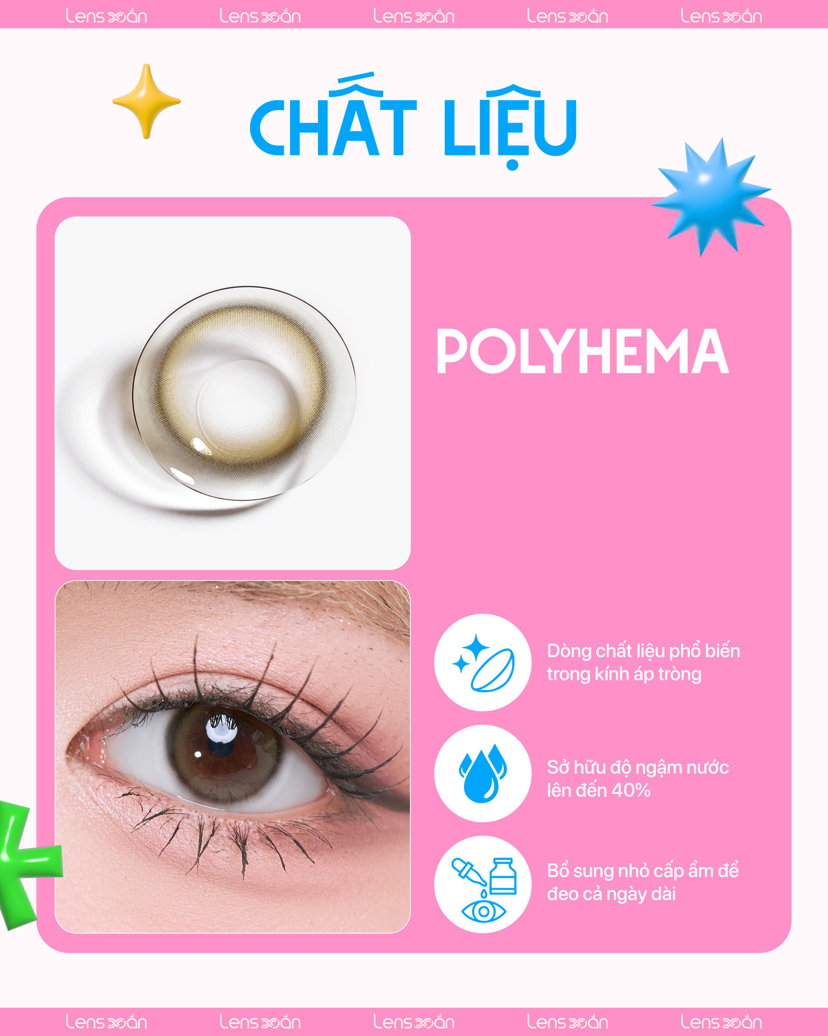 Độ ngậm nước lên tới 𝟒𝟎% giữ ẩm tốt cho đôi mắt xinh cả ngày dài kết hợp cùng độ thoáng khí cao thoải mái cho các lens-ers flex cả ngày dài mà không lo về vấn đề cộm hay mỏi.