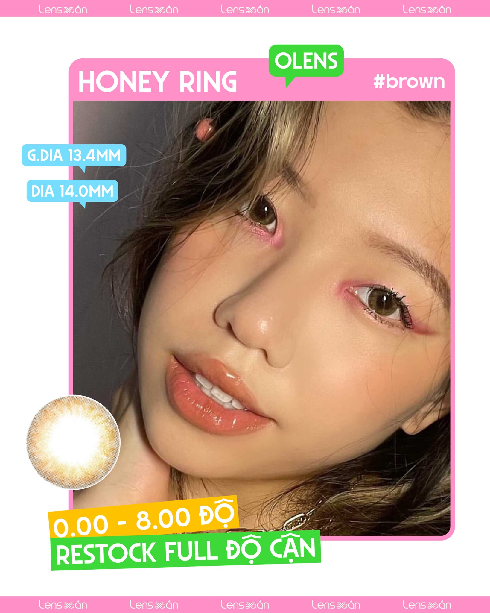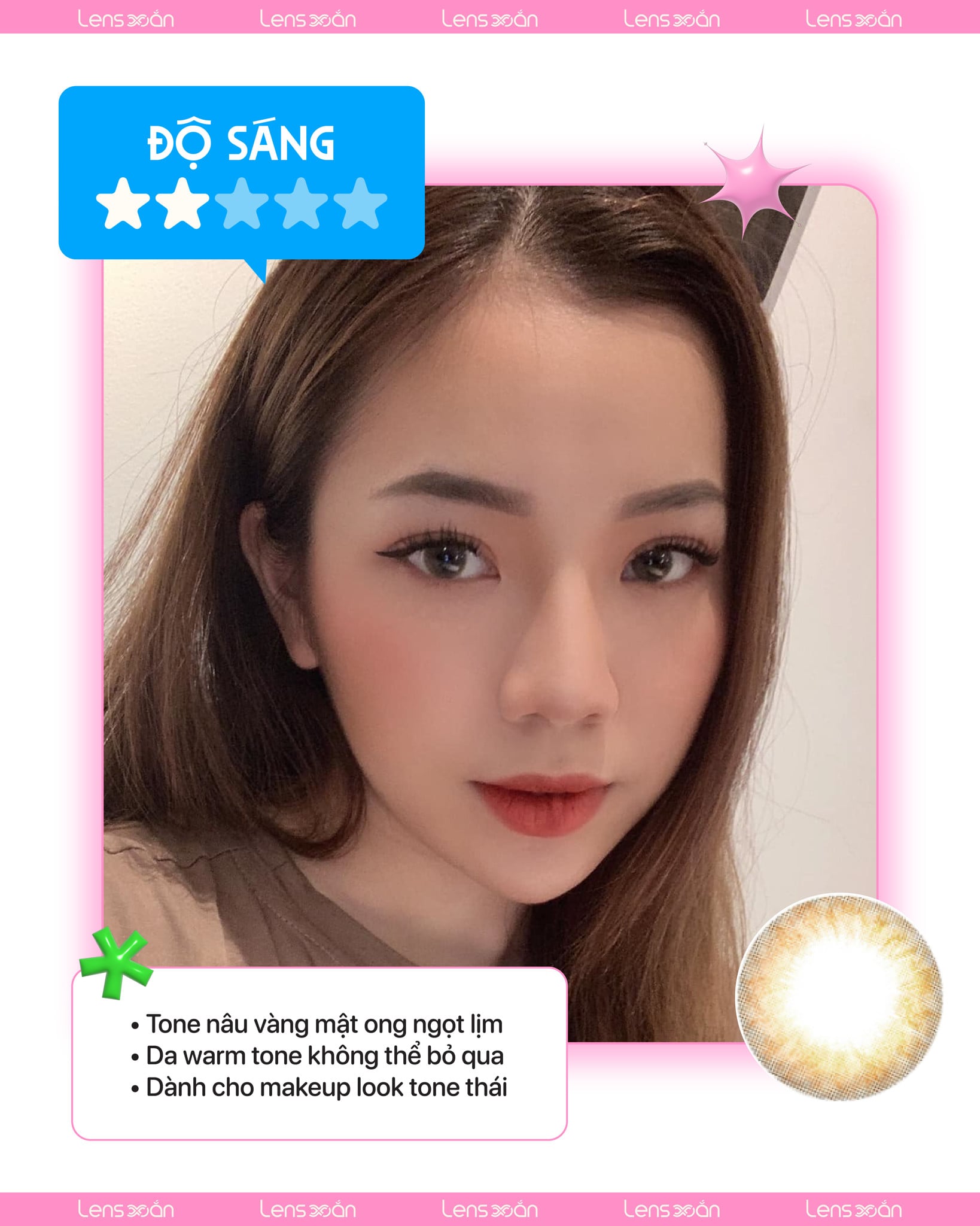 Nâu mật ong trong veo nhẹ nhàng thơ thơ như chính tên gọi của em nó, một chút viền mỏng bên ngoài sẽ làm điểm nhấn khiến đôi mắt có hồn hơn.
