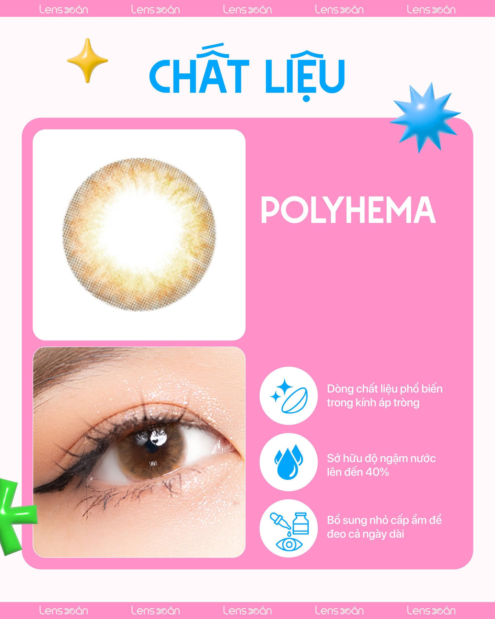 Honey Ring Brown được làm từ Polyhema, là một trong những chất liệu lens phổ biến nhất hiện nay. Đây là chất liệu lens có độ ngậm nước và mức trao đổi oxy tốt, tránh gây cộm hoặc khô mắt trong quá trình sử dụng lens.