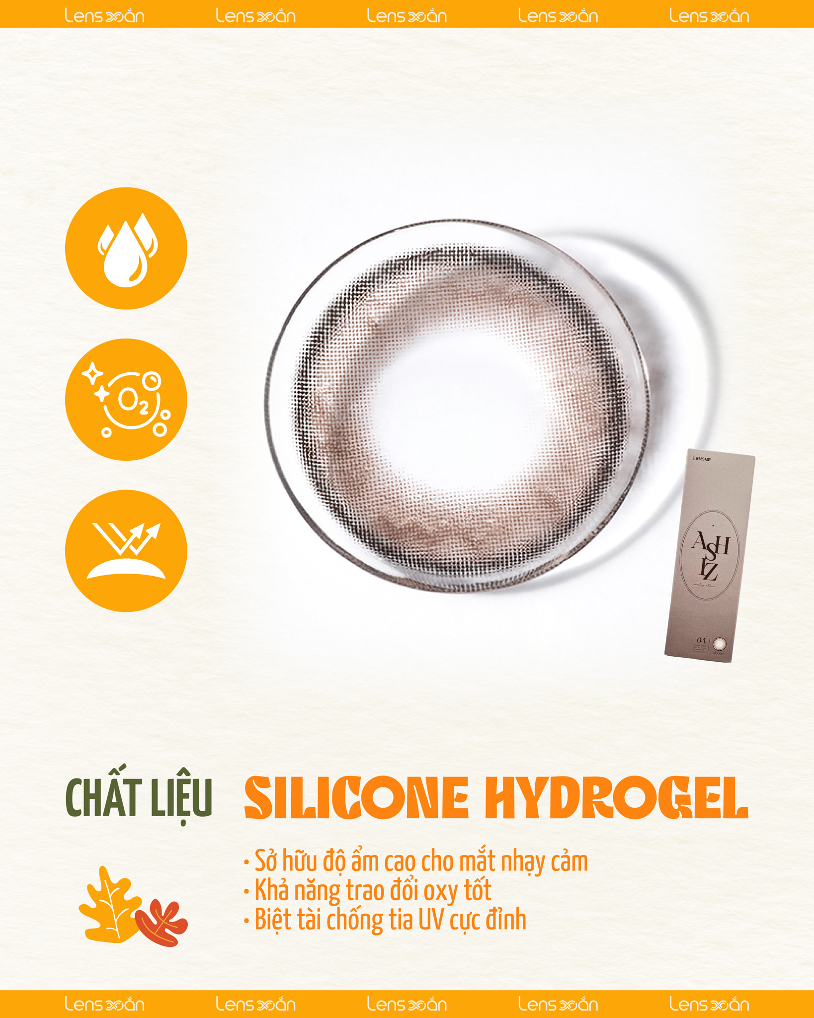 Điểm cộng nổi bật nằm ở chất liệu Silicone Hydrogel cao cấp , hỗ trợ độ ẩm lên tới 48% , đảm bảo độ êm dịu và thông thoáng tuyệt đối – cực kỳ phù hợp với những đôi mắt dễ bị kích ứng hoặc phải đeo lens trong thời gian dài.