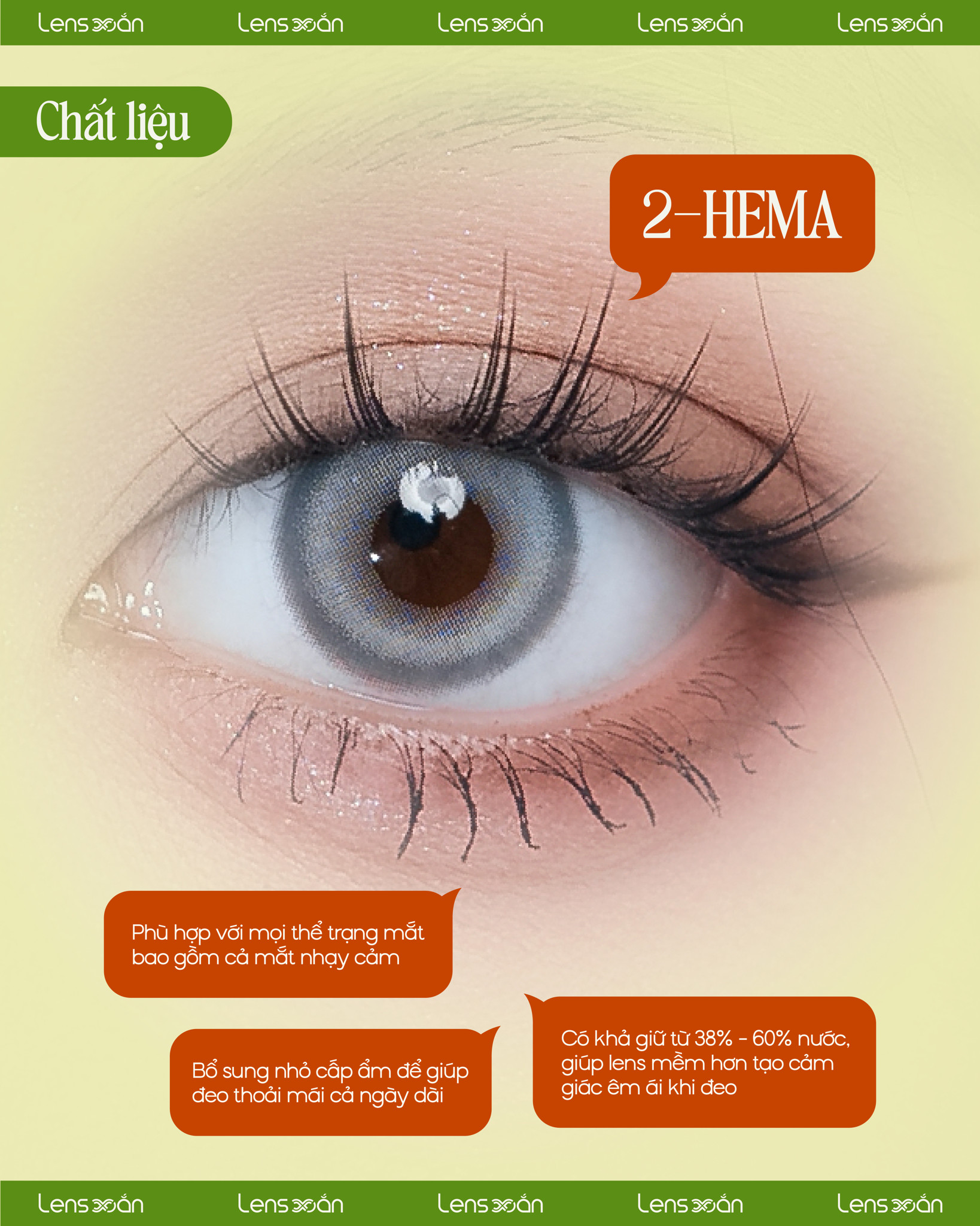 Đường kính G.DIA 13.3mm giúp đôi mắt bạn trở nên to tròn và thu hút hơn, đồng thời mang đến cảm giác nhẹ nhàng, tự nhiên. Sản phẩm được chế tạo từ chất liệu 2 - HEMA mới, cung cấp độ ẩm cao cho những đôi mắt khó chiều. Ngoài ra, em này còn có khả năng chống tia UV, lý tưởng cho những ngày hè nắng nóng.
