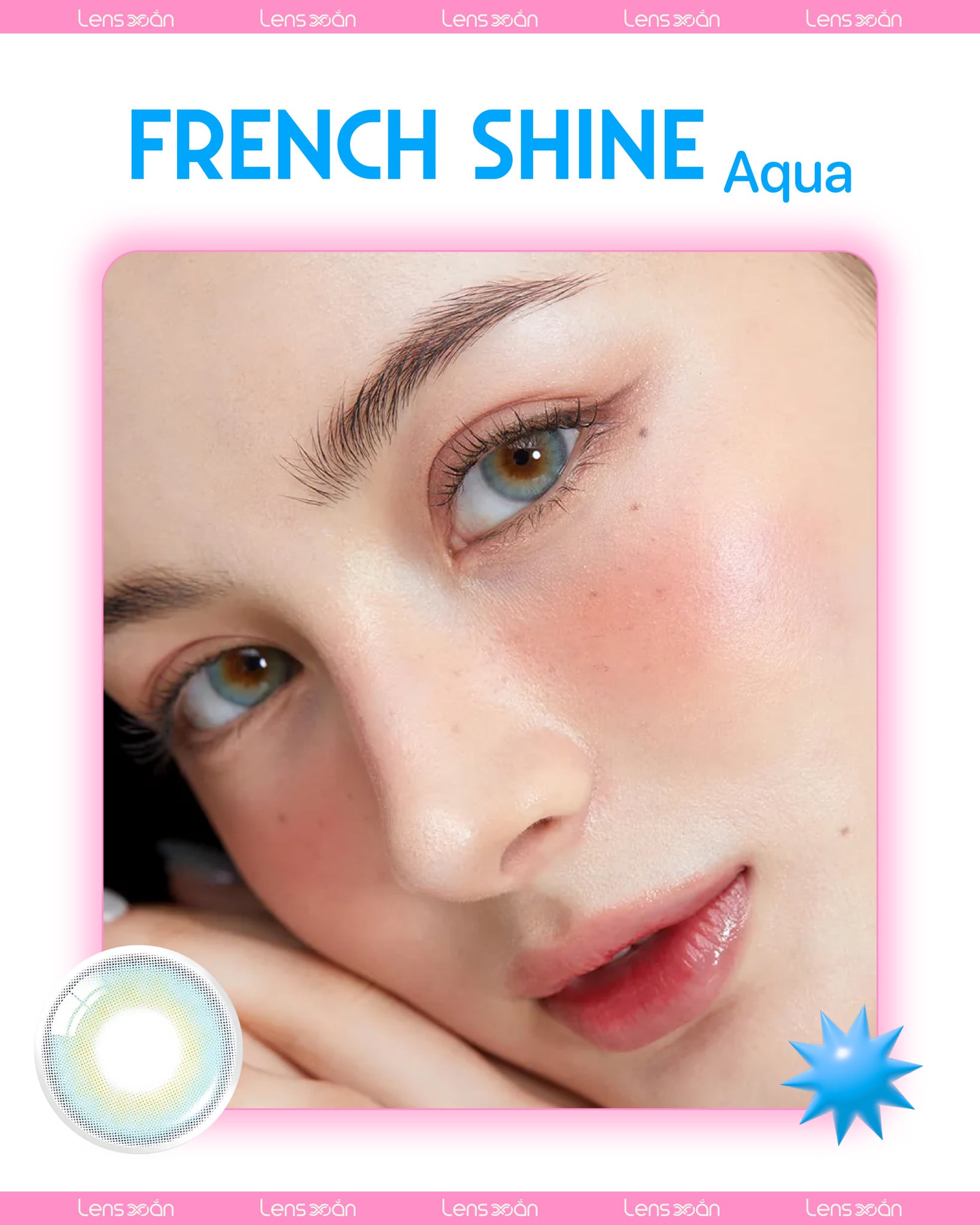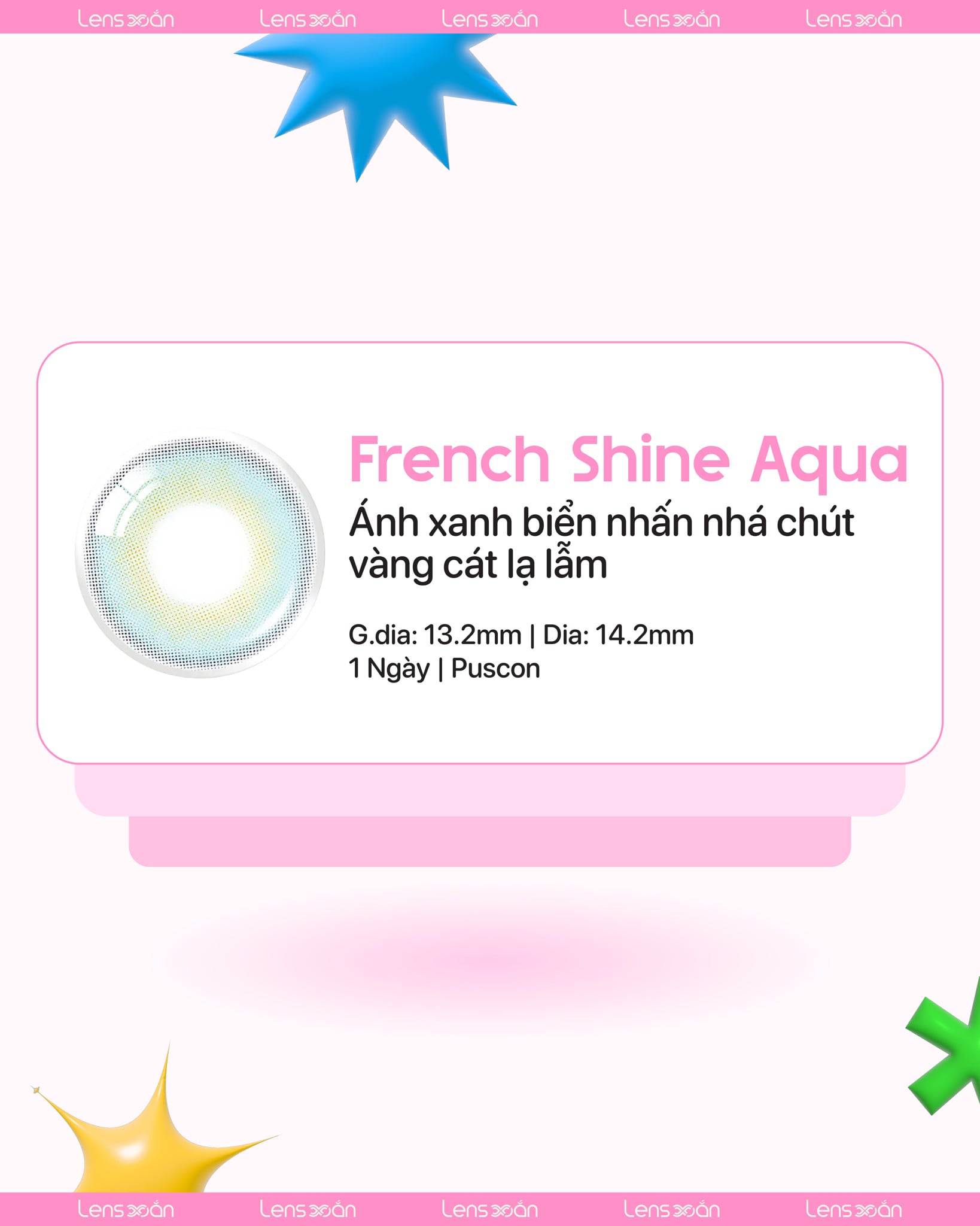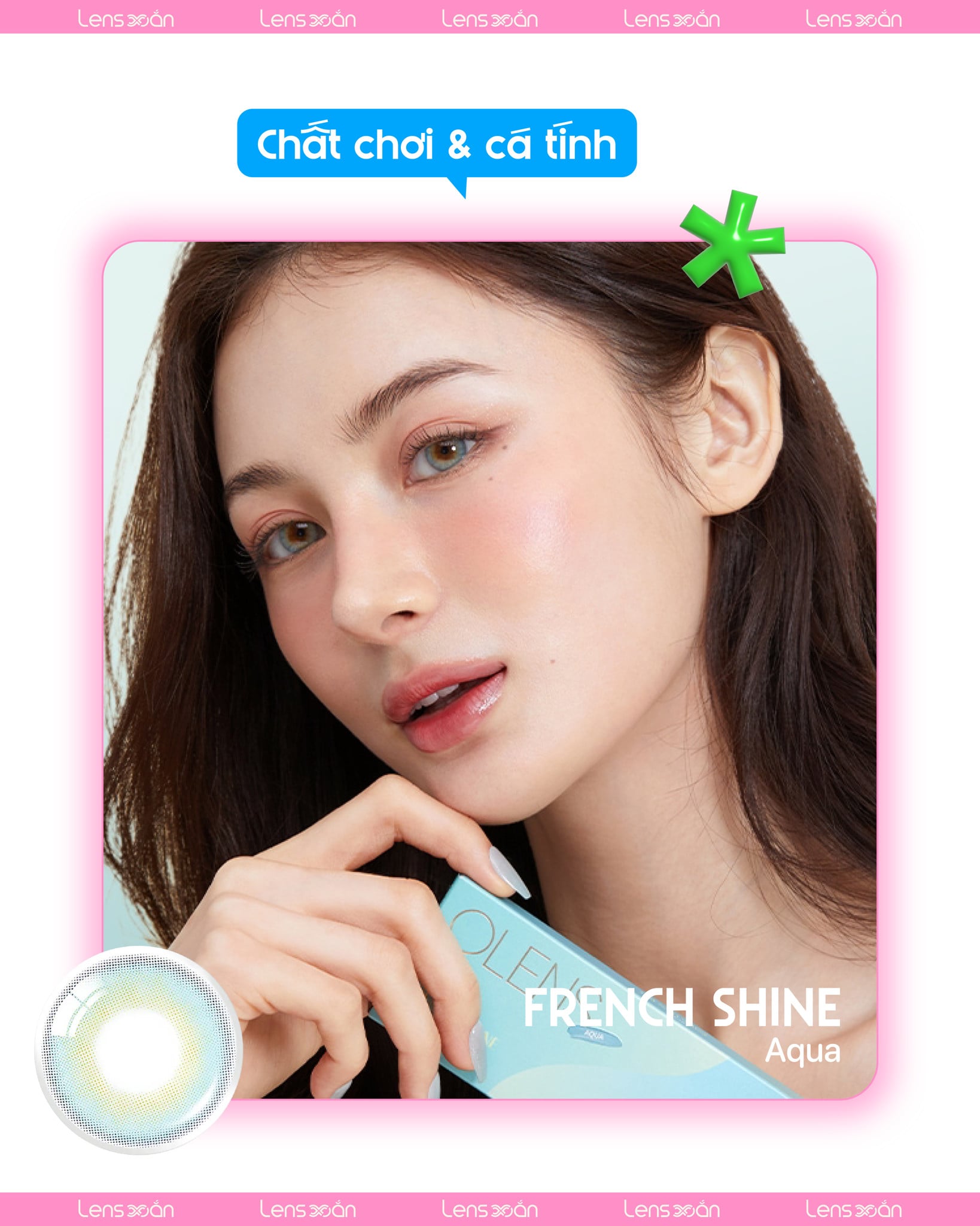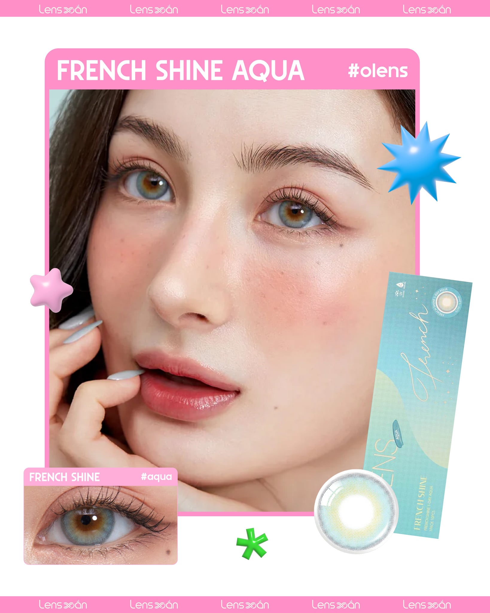 French Shine Aqua là một trong những mẫu kính áp tròng đình đám của Olens , thương hiệu Hàn Quốc nổi tiếng với những thiết kế tinh tế và chất lượng an toàn hàng đầu. Sở hữu sắc xanh trong veo đúng như tên gọi “Aqua”, lens mang lại hiệu ứng ánh nhìn mát lành như mặt biển mùa hè, vừa dịu dàng, vừa cuốn hút một cách khác biệt.
