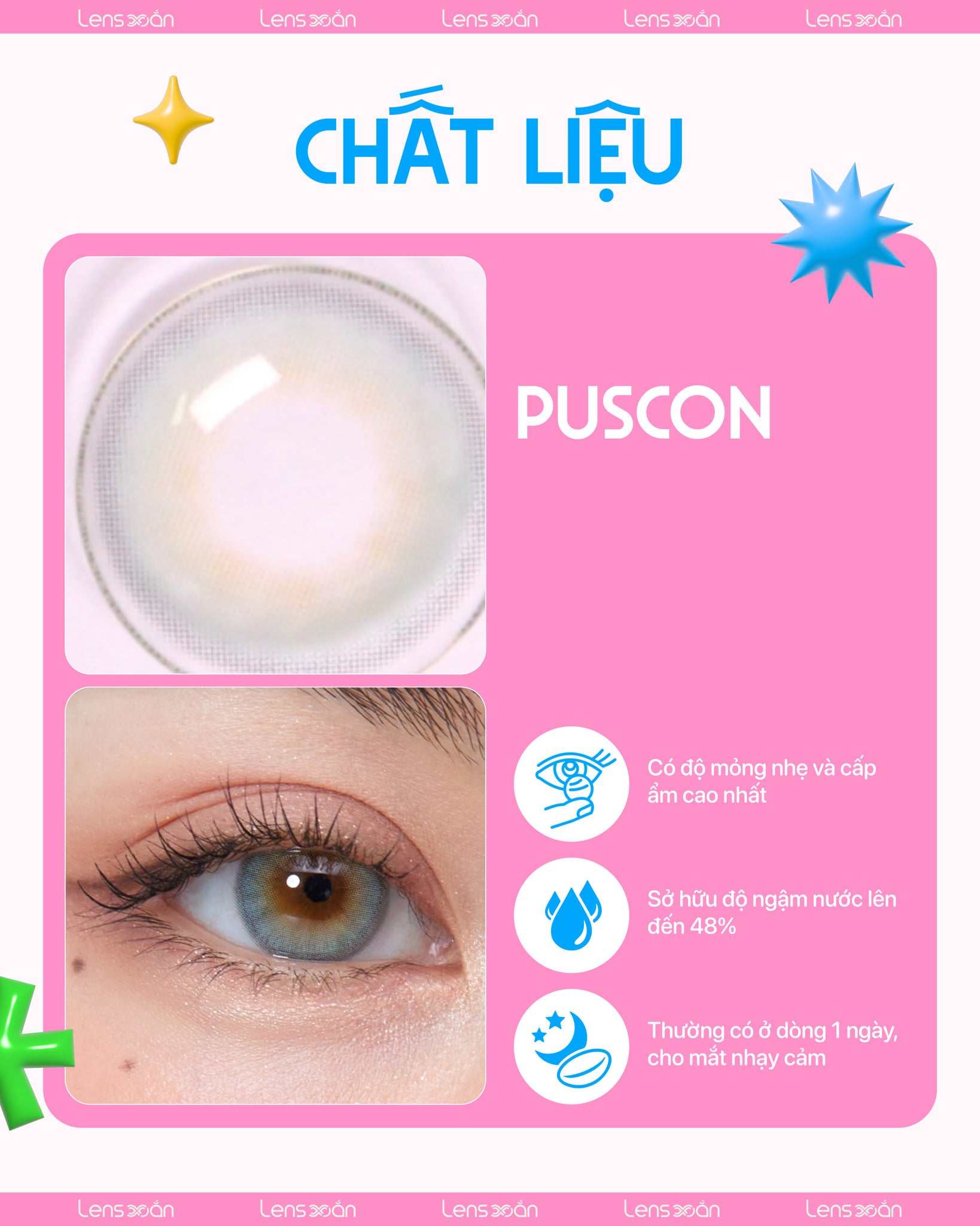 Với thông số GDIA 13.2mm và DIA 14.2mm , French Shine Aqua mang lại hiệu ứng giãn nhẹ, làm đôi mắt trở nên to tròn, long lanh mà không hề mất đi sự cân đối tự nhiên. Chất liệu Puscon cao cấp – loại vật liệu đặc biệt chỉ có ở dòng lens 1 ngày của Olens – mang đến khả năng cấp ẩm vượt trội tới 48% , giúp đôi mắt luôn dễ chịu, mềm mại và tránh khô rát ngay cả khi đeo trong nhiều giờ liền. Đây chính là sự kết hợp hoàn hảo giữa tính thẩm mỹ và sự an toàn, nâng trải nghiệm đeo lens của bạn lên một tầm cao mới.