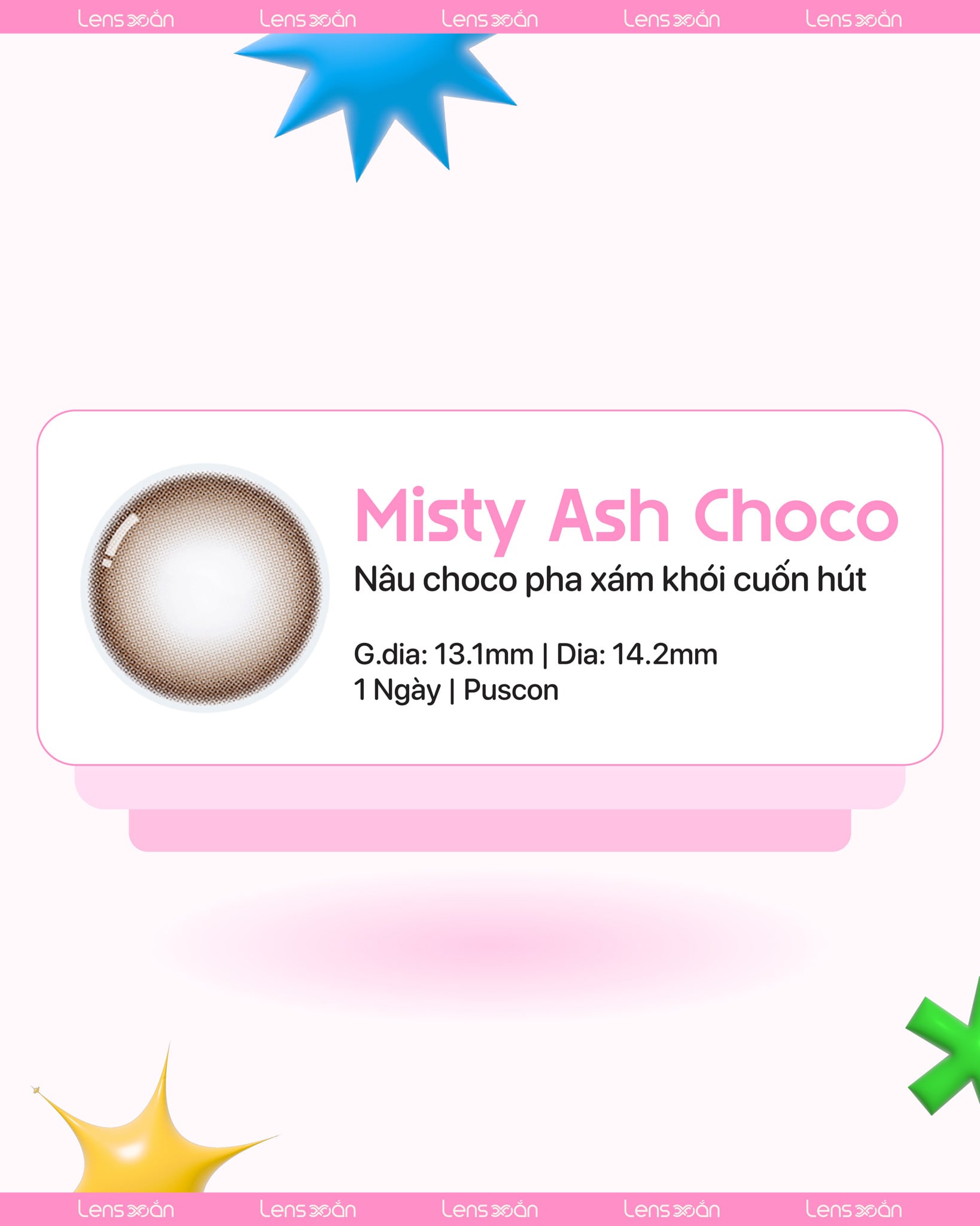 𝑴𝒊𝒔𝒕𝒚 𝑨𝒔𝒉 𝑪𝒉𝒐𝒄𝒐 là dòng lens đi đầu xu hướng? Màu sắc: Nâu choco ánh khói lạ mắt Kiểu dáng: Có viền, không vân G.dia: 13.1mm | Dia: 14.2mm Hạn sử dụng: 1 ngày (kể từ lúc bóc)