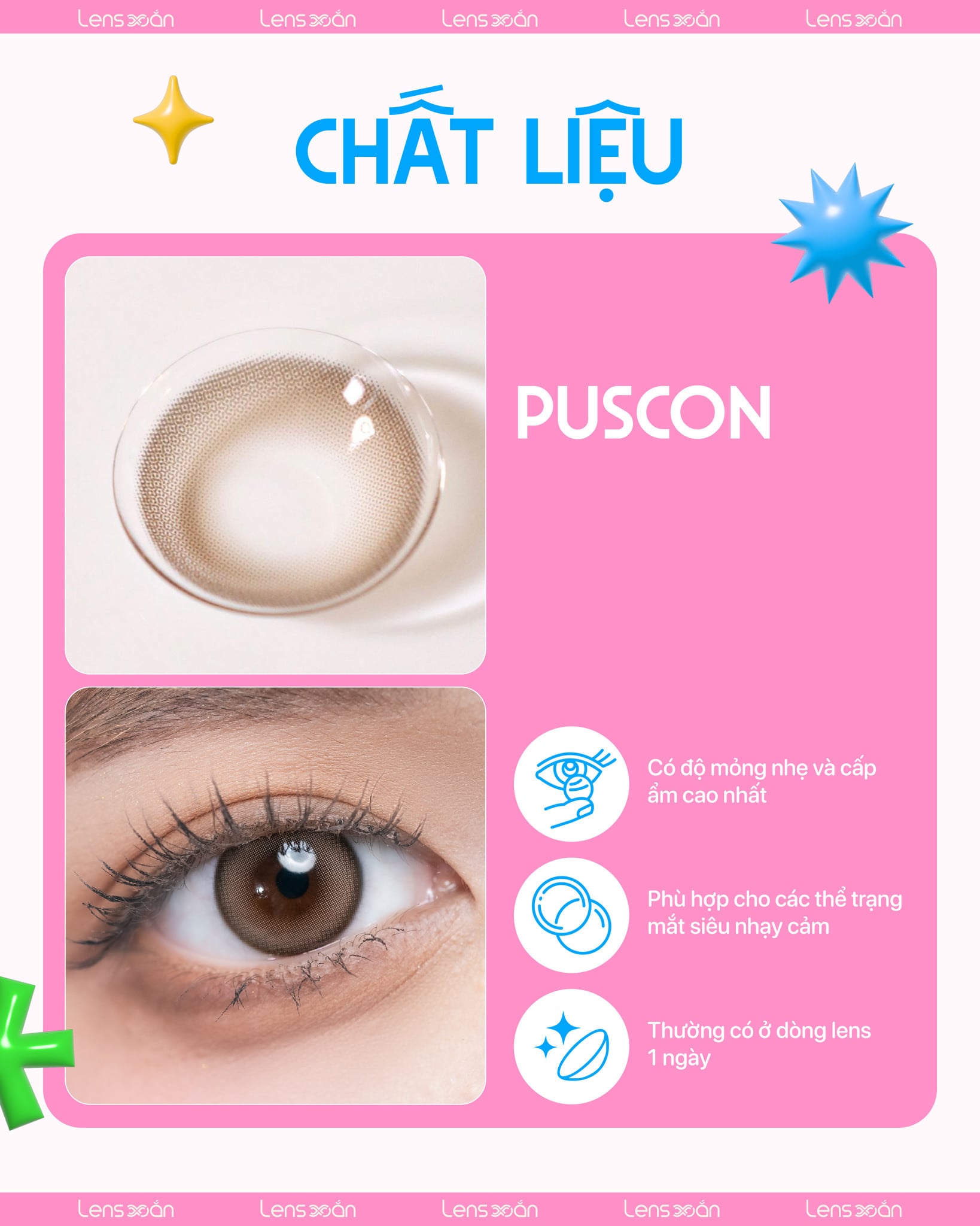 Dòng lens 1 ngày với chất liệu 𝑷𝒖𝒔𝒄𝒐𝒏 luôn nằm trong top chất liệu siêu cao cấp dành cho những đôi mắt nhạy cảm nhất bởi độ ngậm nước và trao đổi Oxy vượt trội hỗ trợ đeo tới 24H không hề gây nhức mỏi hay cay mắt.