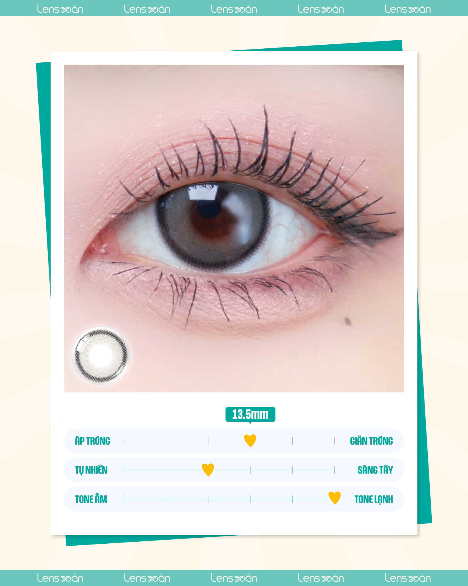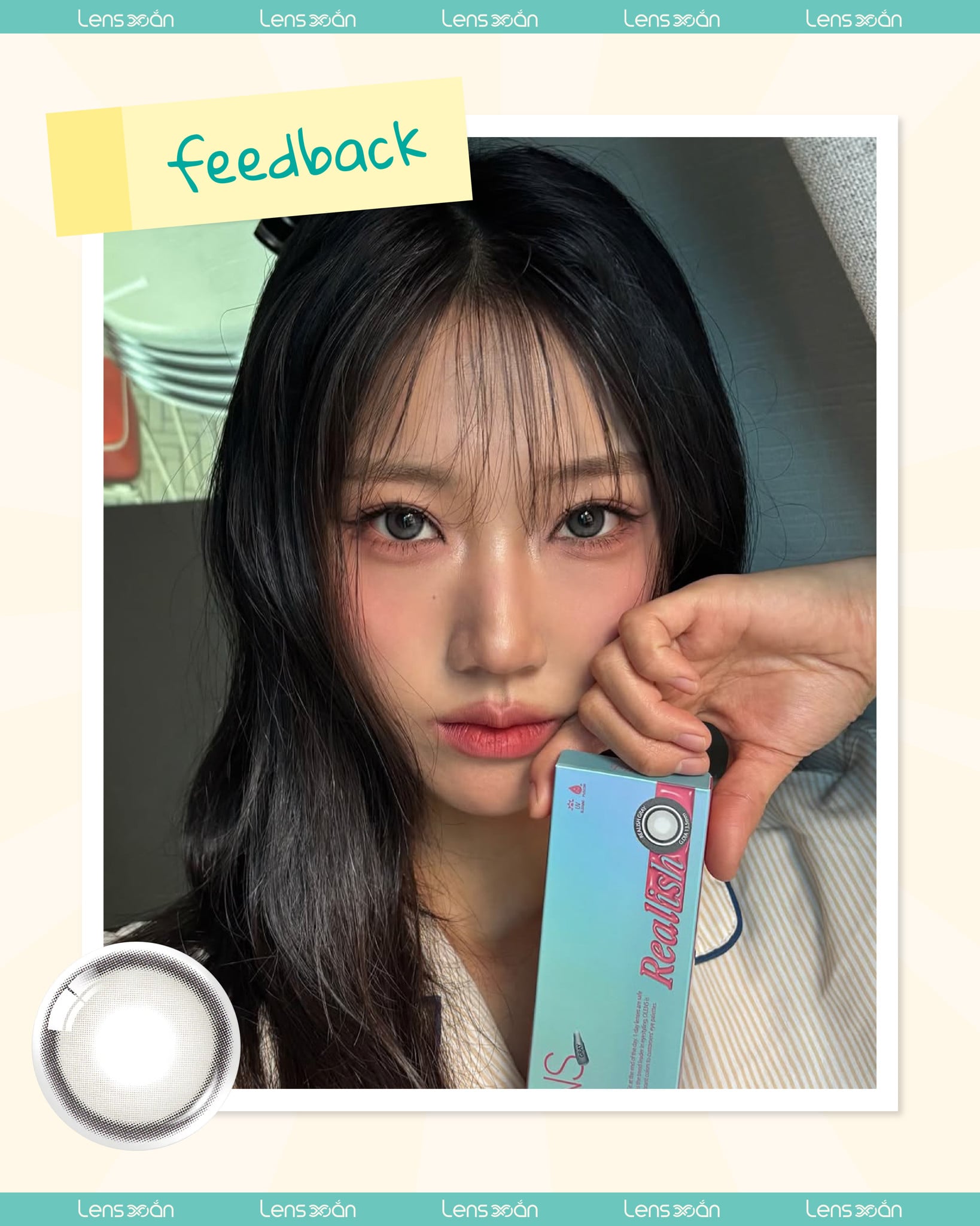 Với thông số GDIA 13.5mm và DIA 14.5mm , Realish Gray mang lại hiệu ứng mắt to tròn rõ rệt mà không bị “quá đà”. Độ giãn này giúp định hình rõ ràng viền mắt, tạo chiều sâu và điểm nhấn nổi bật cho ánh nhìn.