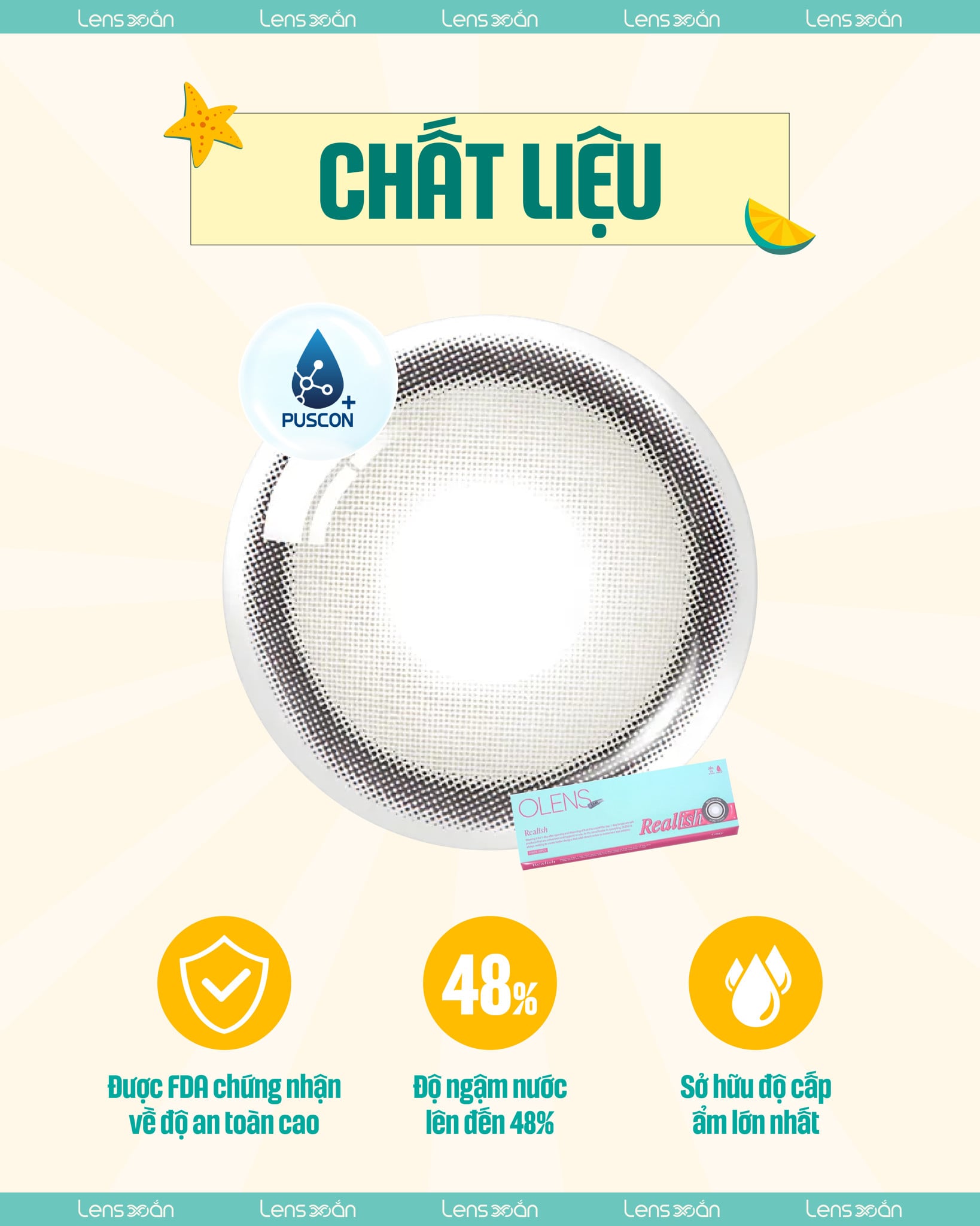Được làm từ Puscon – chất liệu cao cấp nổi tiếng với khả năng giữ ẩm vượt trội và độ tương thích cao với mắt, Realish Gray phù hợp cho cả những người có mắt nhạy cảm. Đây là dòng lens 1 ngày – mỗi ngày một cặp mới, giúp bạn luôn cảm thấy tươi mới, sạch sẽ và an toàn.