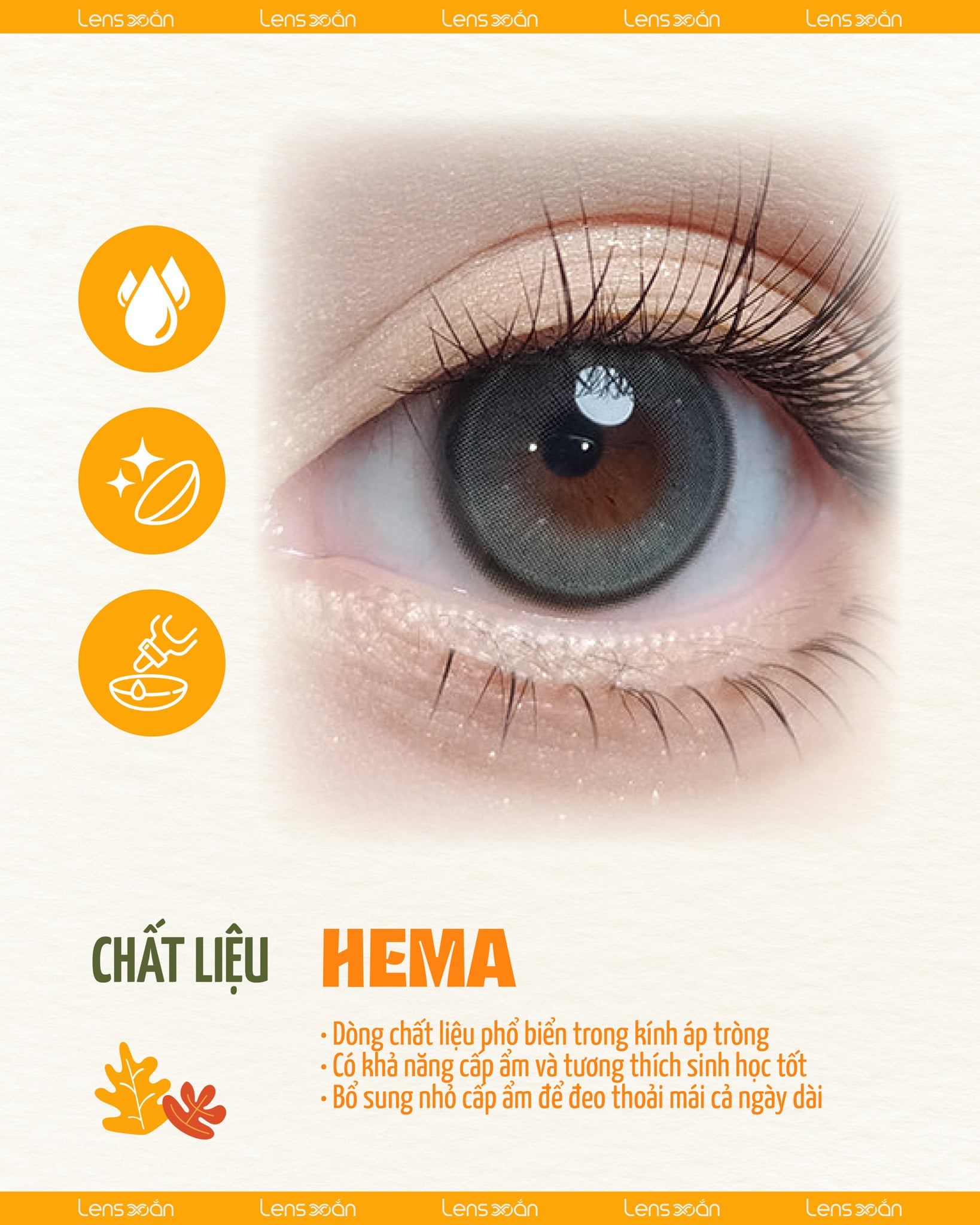 Sở hữu chất liệu HEMA , dòng chất liệu phổ biến trong kính áp tròng hiện nay, "quen mặt" với đa số các tín đồ mê lens. Khả năng cấp ẩm cùng khả năng thoáng khí tốt chính là biệt tài mà chất liệu HEMA sở hữu. Với chất liệu này, mọi thể trạng mắt đều có thể sử dụng, thế nhưng nếu mắt bạn thuộc thể trạng mắt nhạy cảm có thể tham khảo bổ sung thêm nhỏ cấp ẩm chuyên dụng dành cho lens để có trải nghiệm thật thoải mái khi đeo cả ngày dài nhé.