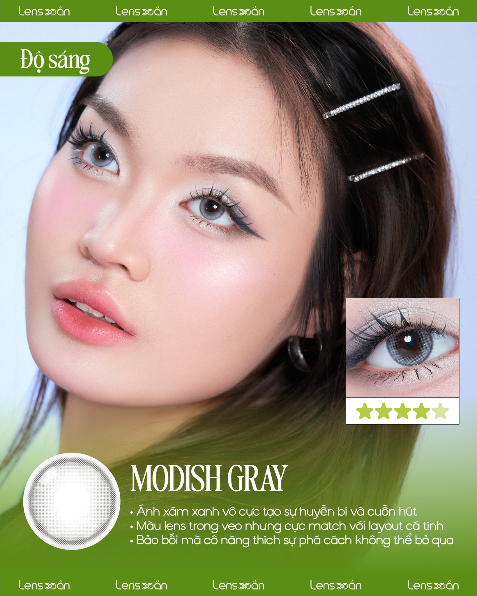 Đặc điểm thiết kế bo tròn, kết hợp với độ bóng nhẹ nhàng, mang đến cho đôi mắt cái nhìn rạng rỡ từ mọi góc độ. Sự chuyển màu tinh tế giữa xám kim loại ánh xanh pastel tạo nên đôi mắt tối màu đầy bí ẩn, nhưng cũng không kém phần dịu dàng, hoàn hảo cho những khoảnh khắc ngọt ngào. Kết hợp với những tông makeup nhẹ nhàng và hiện đại, đôi mắt sẽ trở thành điểm nhấn quyến rũ, khiến bạn tỏa sáng hơn trong từng khoảnh khắc.