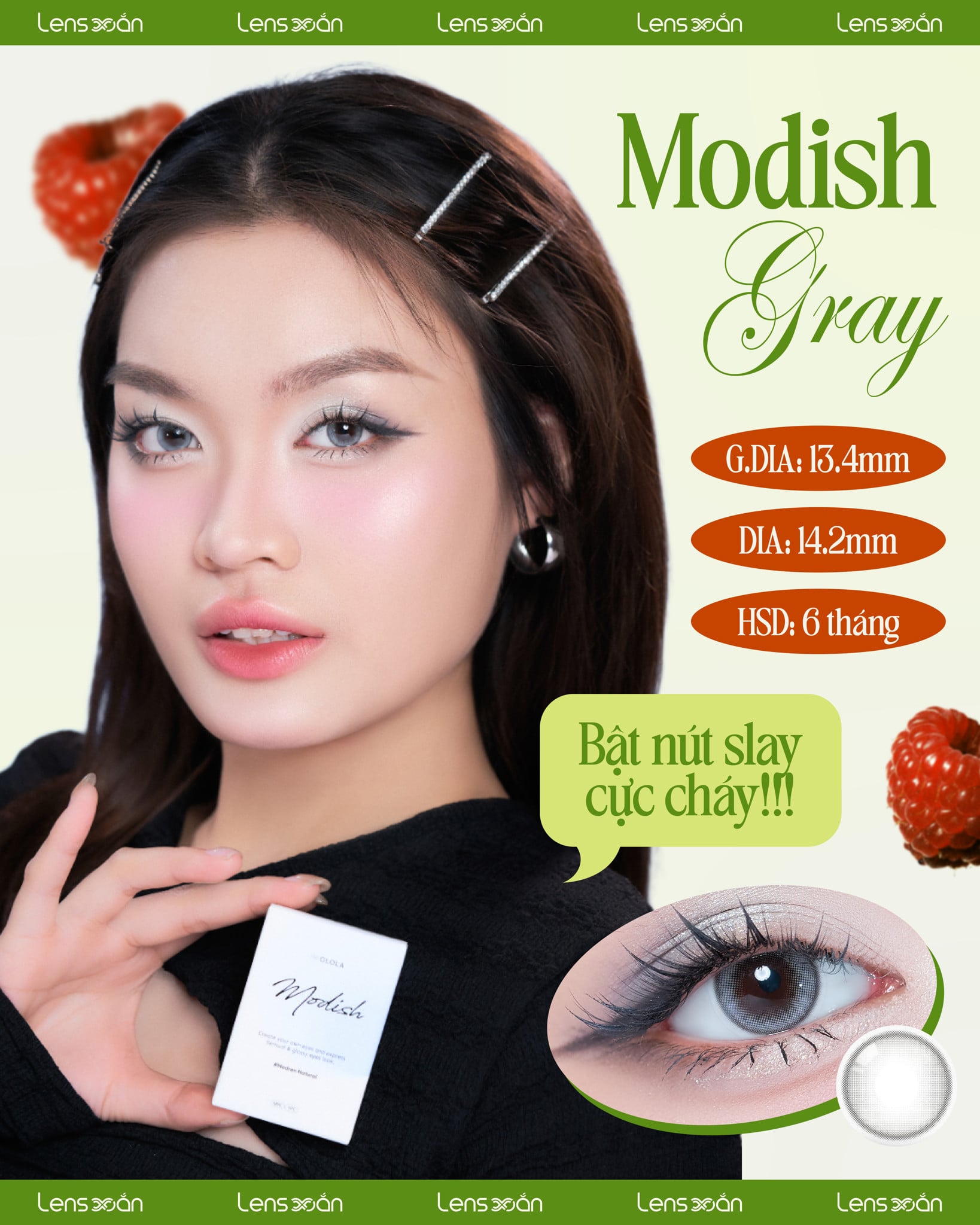 Hãng Olola Hạn sử dụng 6 tháng Graphic dia (Đường kính phần màu) 13.4mm Dia (Đường kính phần màu và viền trong) 14.2mm Chất liệu MPC Polymer + Silicone hydrogel