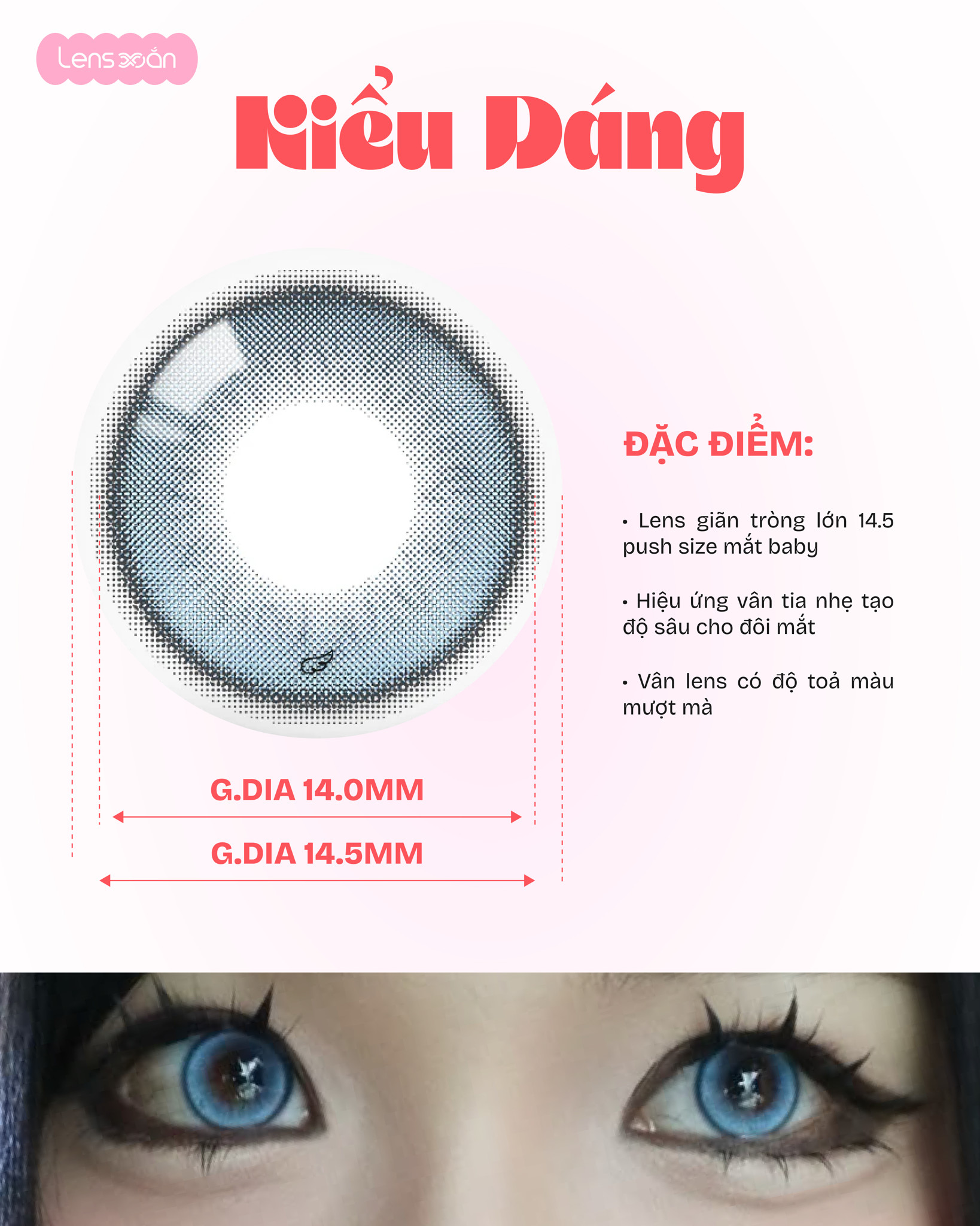 Thiết kế giãn tròng lớn là điểm đặc trưng của RYU'S SKY MUSE BLUE – OLOLA . Với Graphic DIA 14.0 mm và DIA 14.5 mm , lens mang lại hiệu ứng mắt baby rõ rệt, giúp đôi mắt trông to tròn hơn và nổi bật hơn trong tổng thể gương mặt. Viền lens được thiết kế mềm mại giúp định hình ánh nhìn rõ ràng nhưng không làm mắt bị cứng, tạo nên tổng thể vừa đáng yêu vừa nổi bật.