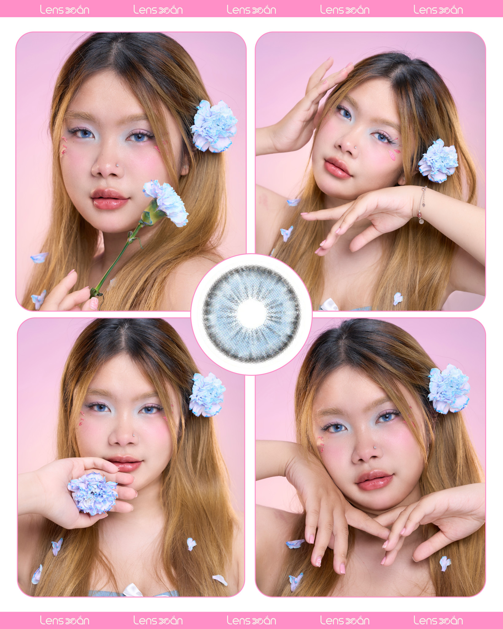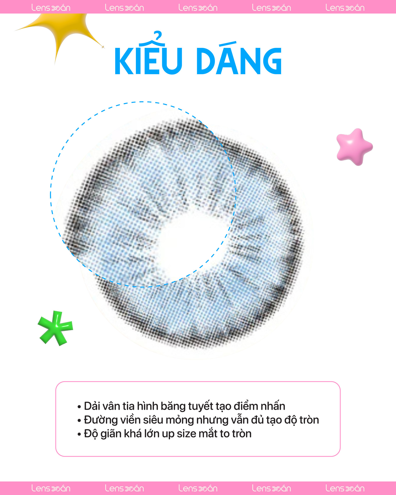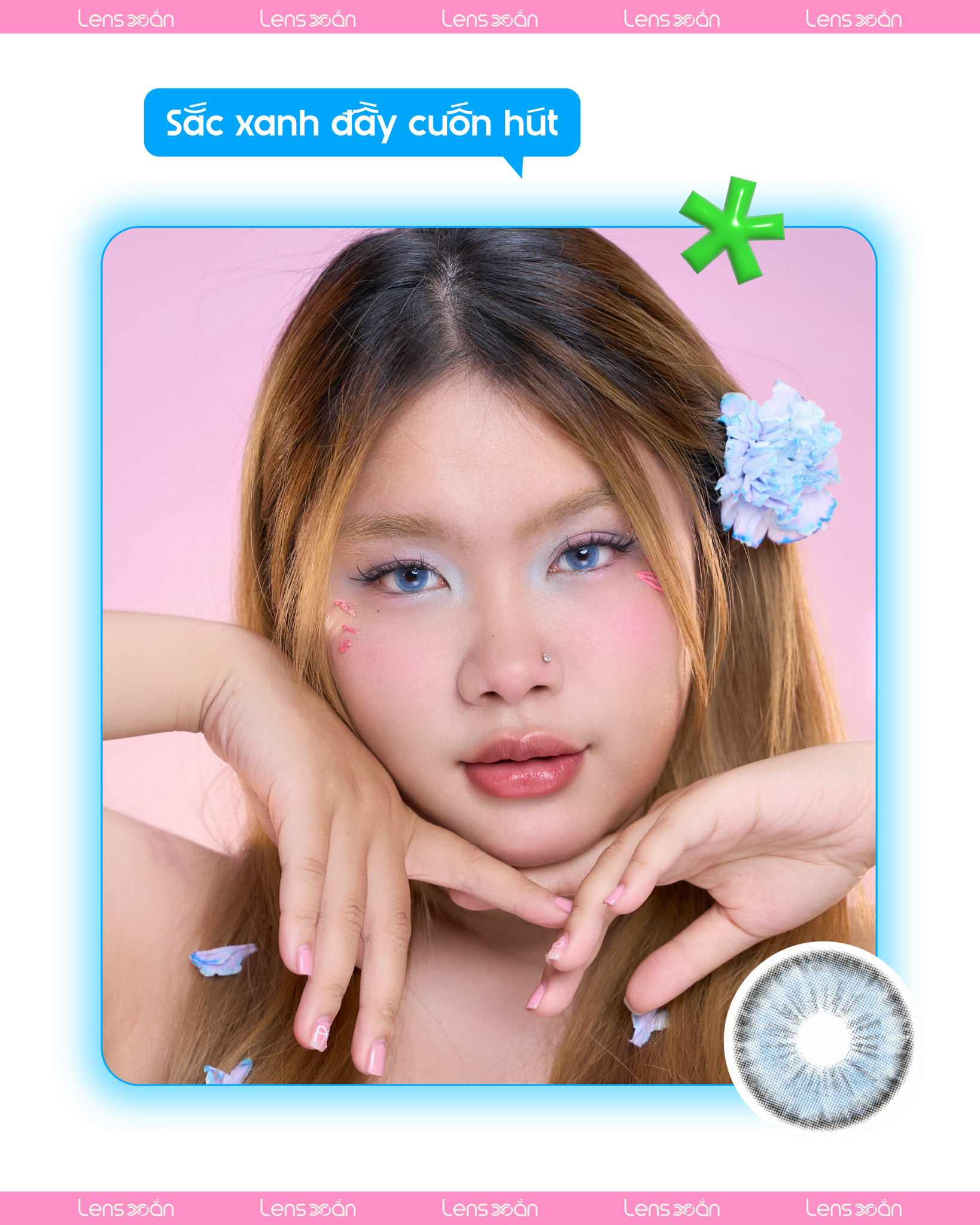 Tone xanh dương ngọc bích tươi mát độc đáo, nổi bật nhưng không hề khó đeo, ngược lại còn tạo điểm nhấn cho đôi mắt. Thiết kế viền tạo mỏng tạo hiệu ứng viền đen trong mắt kết hợp với hiệu ứng vân tia giúp mắt to tròn và có chiều sâu hơn.