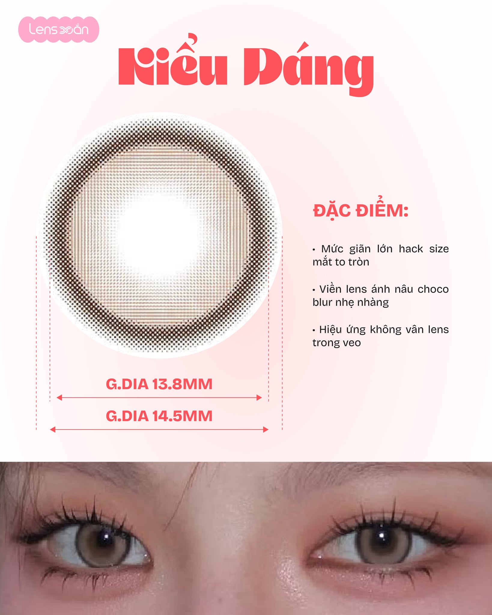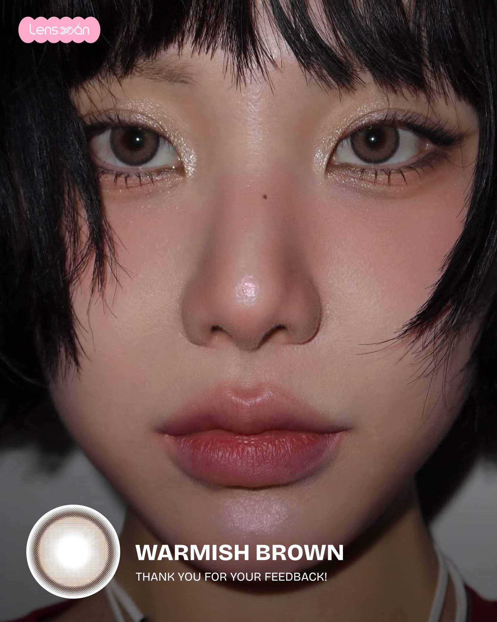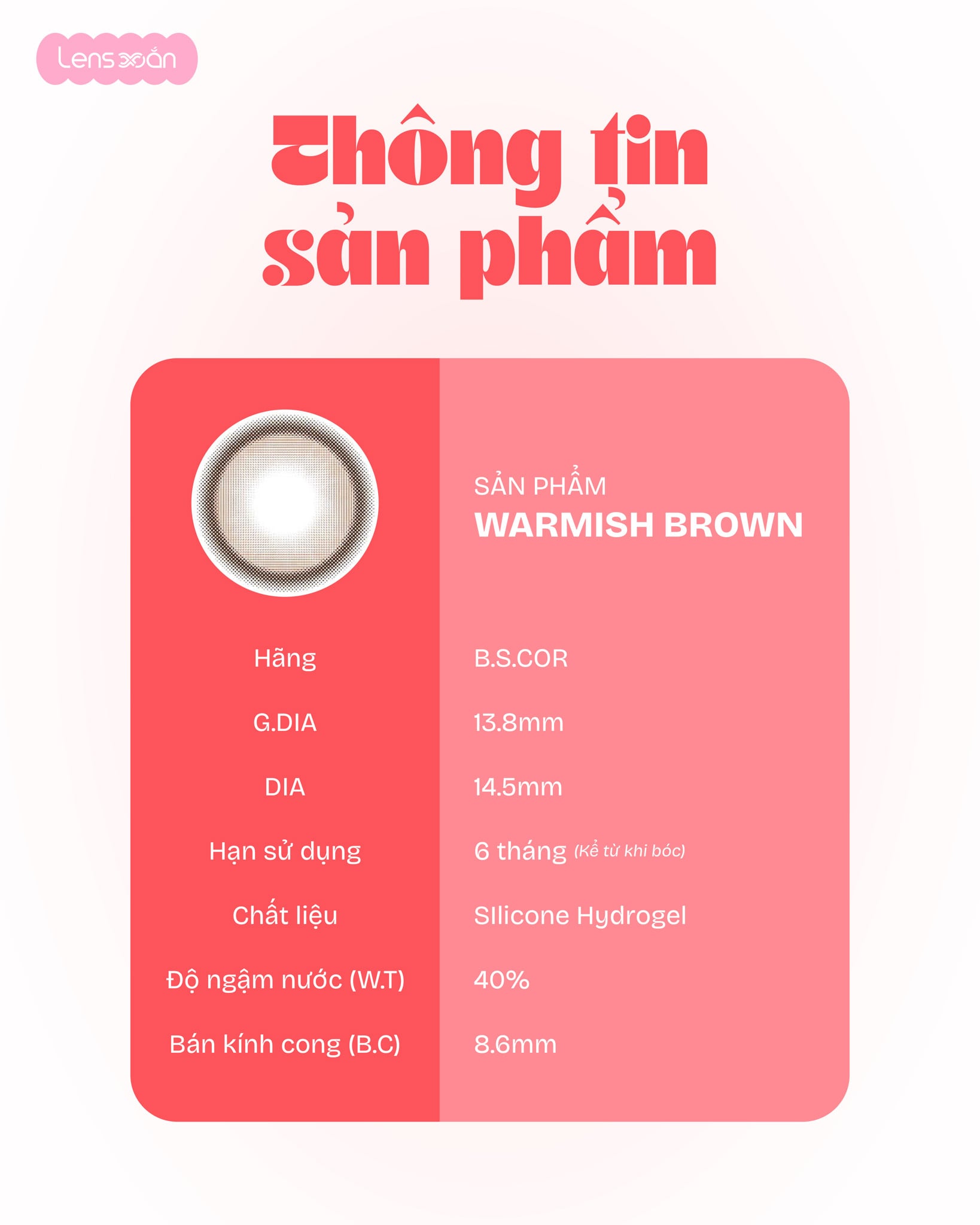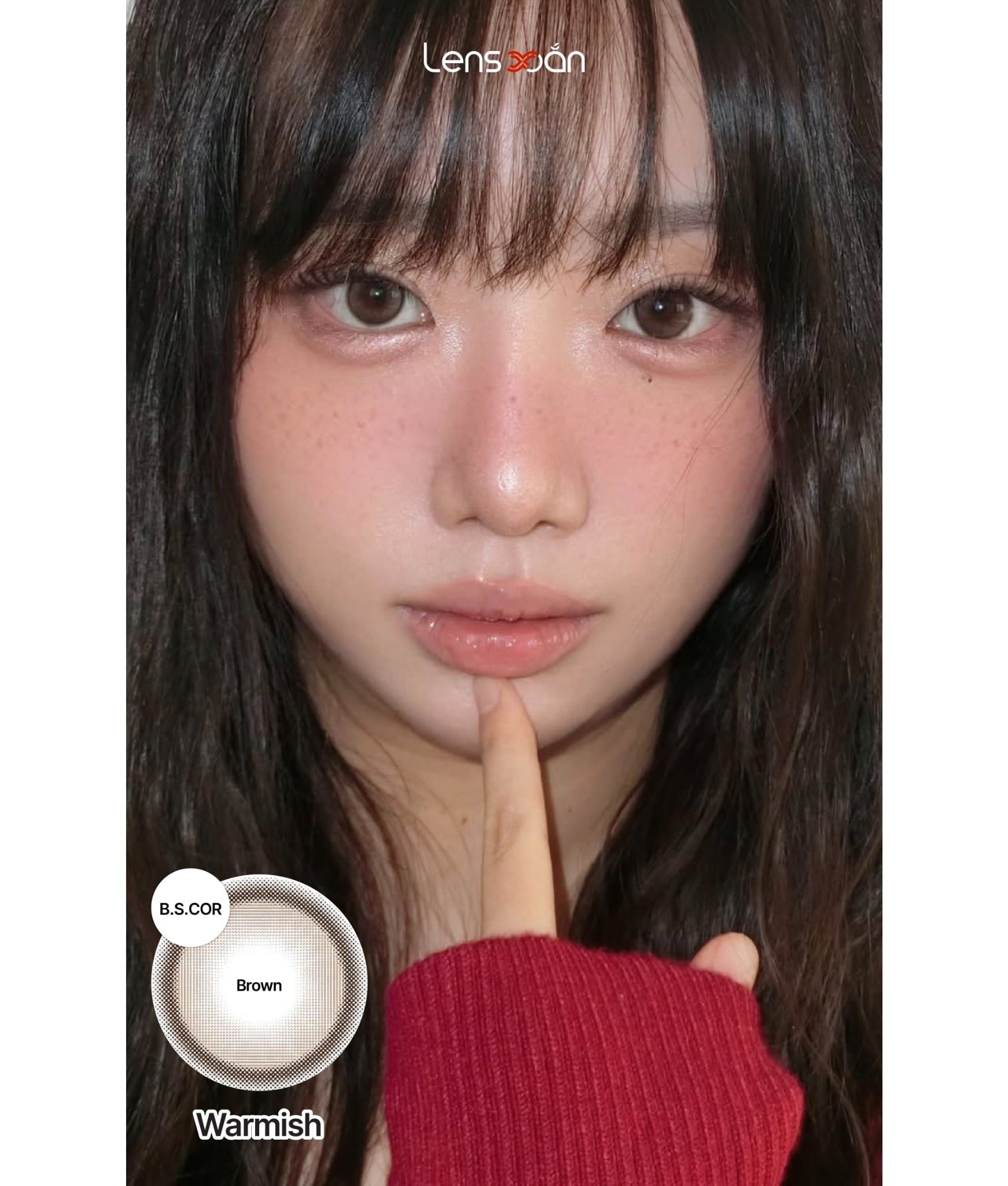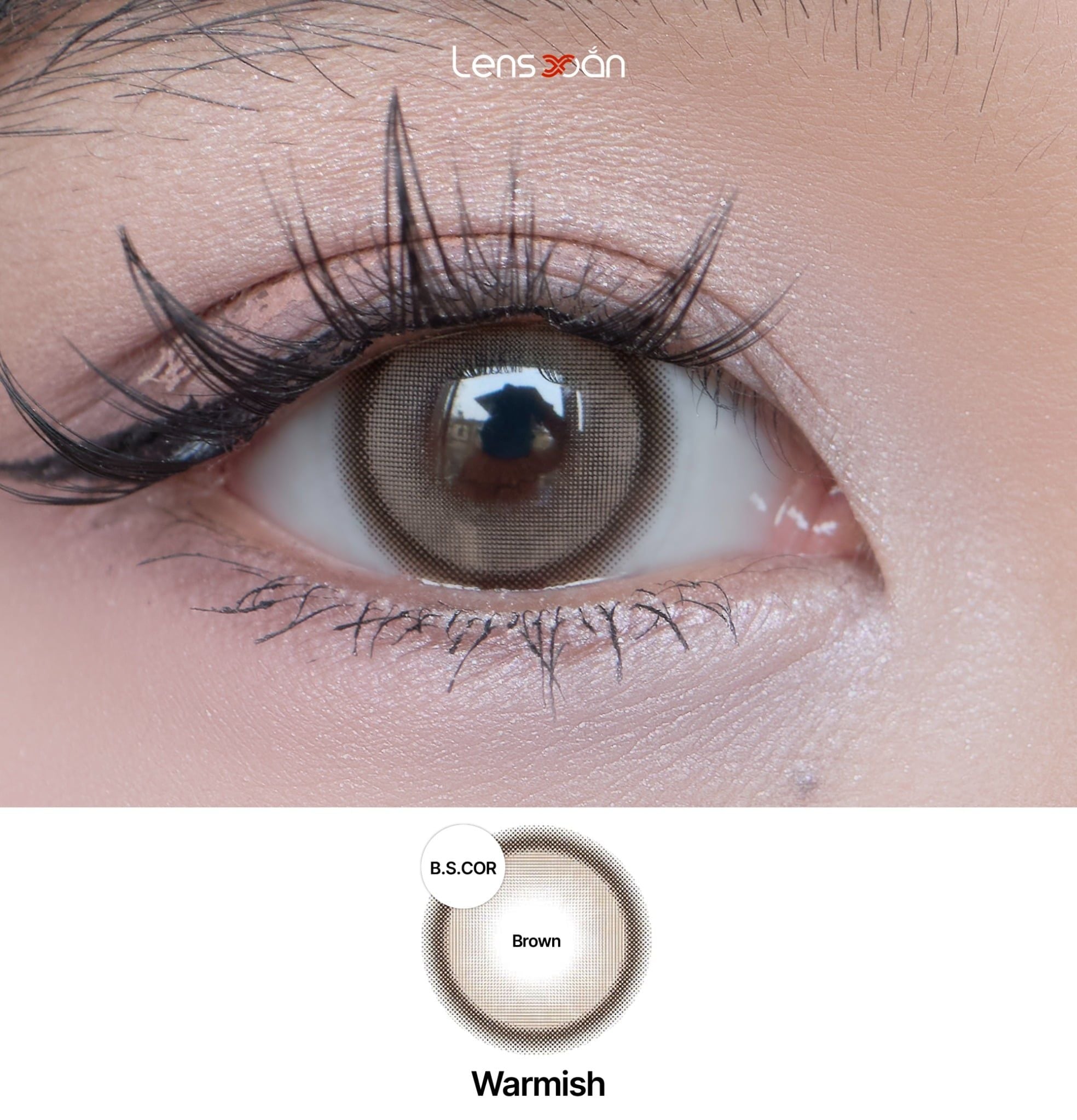 Với Graphic DIA 13.8 mm cùng DIA 14.5 mm , WARMISH BROWN – B.S.COR mang lại hiệu ứng hack size mắt rõ rệt, giúp mắt trông to hơn, tròn hơn mà vẫn hài hòa với tổng thể khuôn mặt. Đây là lựa chọn cực kỳ phù hợp cho những bạn thích lens giãn to, mắt búp bê nhưng vẫn muốn giữ nét tự nhiên, dễ ứng dụng trong đời sống hằng ngày.